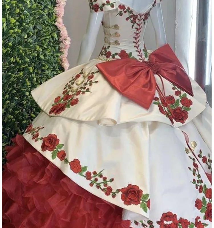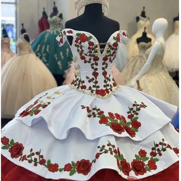 Новинка 100%, романтические 3D цветочные цветы, белый и красный, с открытыми плечами, с вырезом, атласная ткань, Кепка с короткими рукавами, со шнуровкой сзади, полная длина, дизайнер принцессы, vestido De 15 Anos Quinceanera Вечерние Выпускные вечерние свадебные платья для гостей для женщин Милые 15 16 Бальные платья