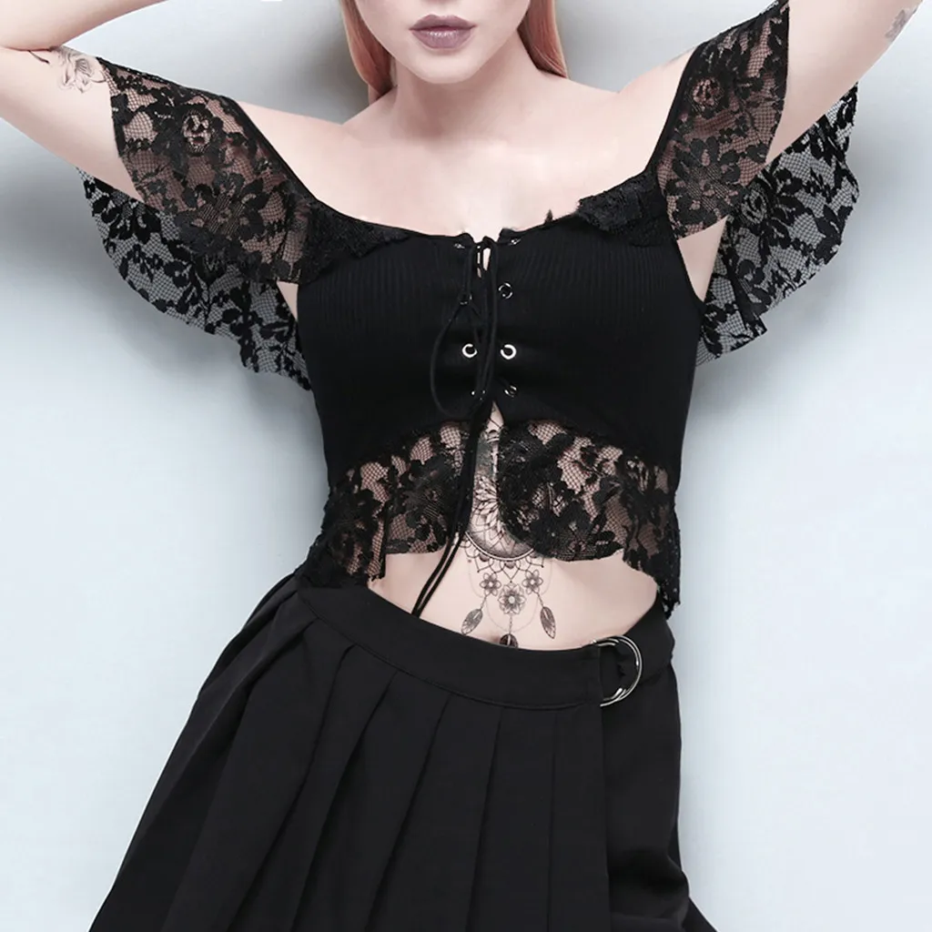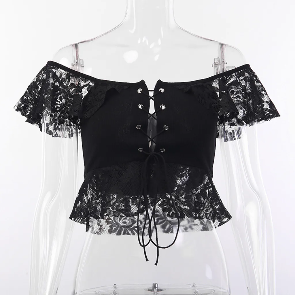 Женский винтажный, готический, в стиле панк, черный укороченный топ, сексуальный, с открытыми плечами, перекрещивающиеся, бандажные рубашки, открытые, цветочные кружева, ребристые, вязаные, вечерние блузки