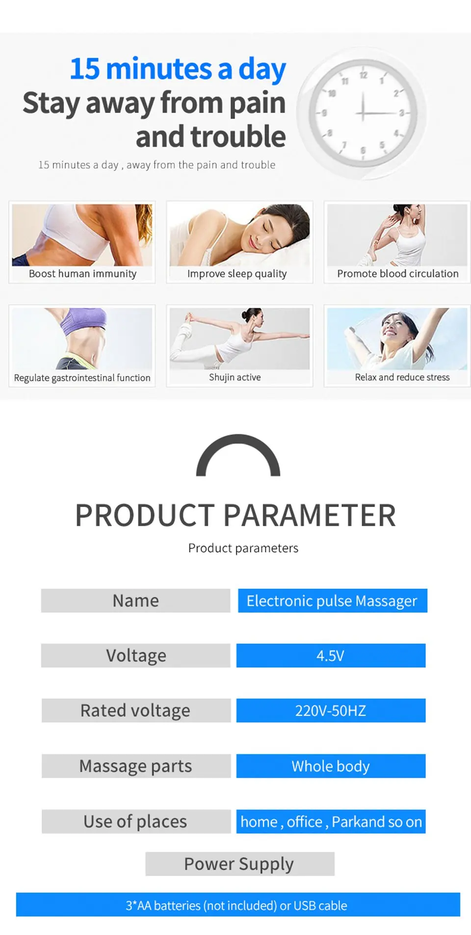 Продукт специально разработан для уменьшения боли в мышцах. Аппарат может производить лечебный эффект, особенно для больных, страдающих от боли в шее, спине, пояснице и различных суставах. Эксклюзивная программа dsigned состоит из различных волн через altematic cpmposition, давая ощущение ручного массажа вручную. Мягкий и мягкий Пульс может улучшить циркуляцию крови и повысить основные и сопутствующие каналы разблокированы и дать особый эффект на высвобождение усталости. Используйте импульсный массажер kw305 для: жесткости плеч. Paralysisof периферических нервов. Восстановления усталости. Улучшает кровообращение невралгии. Постепенное снижение мышечной боли