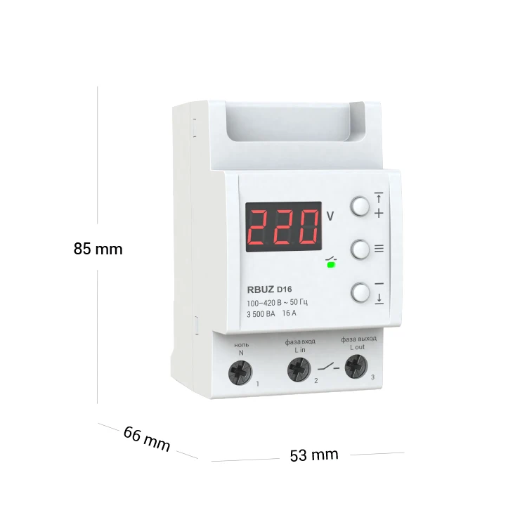 Однофазное реле напряженияОднофазное реле напряжения RBUZ D16-32 помогает защитить электрооборудование от чрезмерных колебаний напряжения в сети. Устройство отключает нагрузку при наступлении критической ситуации. Вы можете выбирать верхний предел напряжения в диапазоне от 220 до 280 В и нижний — от 120 до 210 В. Реле также защищает от обрыва нулевого провода на ЛЭП с попаданием его на фазу. Модель чаще всего применяется с контакторами (магнитный пускатель, силовое реле).При наступлении аварийной ситуации в сети реле отключает подачу нагрузки до полной стабилизации напряжения.Таймер задержки подачи нагрузкиПосле того как напряжение стабилизируется, реле возобновит подачу нагрузки через заданное время задержки. Вы можете самостоятельно установить длительность задержки от 3 до 600 с (шаг 3 с). Для компрессорного оборудования, например холодильников и кондиционеров, мы рекомендуем устанавливать ее длительность на 120–180 с.Легкая настройка параметровУправление устройством осуществляется только тремя кнопками. Цифровой экран отображает значение напряжения и системную информацию. С его помощью можно легко установить верхний и нижний предел допустимого напряжения. Также экран упрощает навигацию в меню.На корпусе содержится зеленый индикатор, который сигнализирует о подаче напряжения.Простая установкаМонтаж реле напряжения RBUZ D16-D32 осуществляется в распределительный щит на стандартную DIN-рейку шириной 35 мм. Если в помещении существует вероятность попадания воды на устройство, тогда щит должен иметь класс защиты IP55 по ГОСТ 14254.