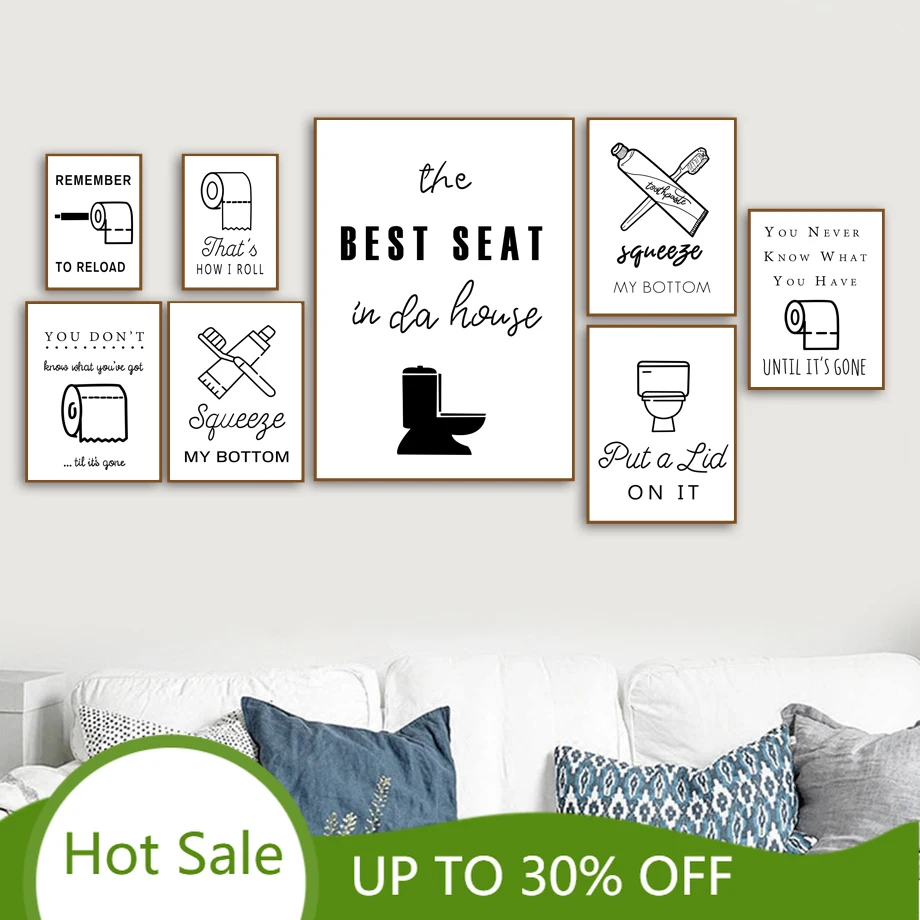 Настенная Картина на холсте в ванную комнату, черно-белый плакат, туалетная бумага, зубная паста, зубная щетка, печать, цитаты, принты, уборная комната, украшение для туалета