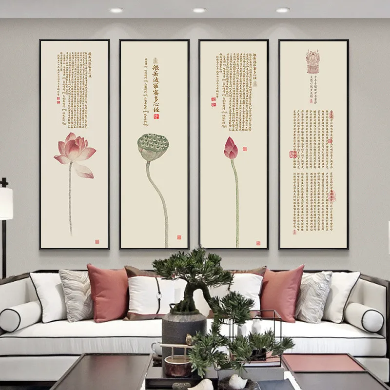 Традиционная китайская каллиграфия сердца сутра, лотос, холст, печать, живопись, плакат, искусство, Настенная картина для гостиной, домашний декор