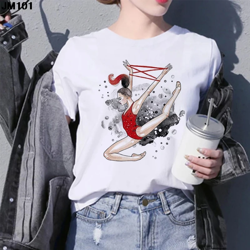 Футболка женская с акварельным принтом, белый топ с изображением балерины, гимнастики, танцев на заказ, в стиле Харадзюку