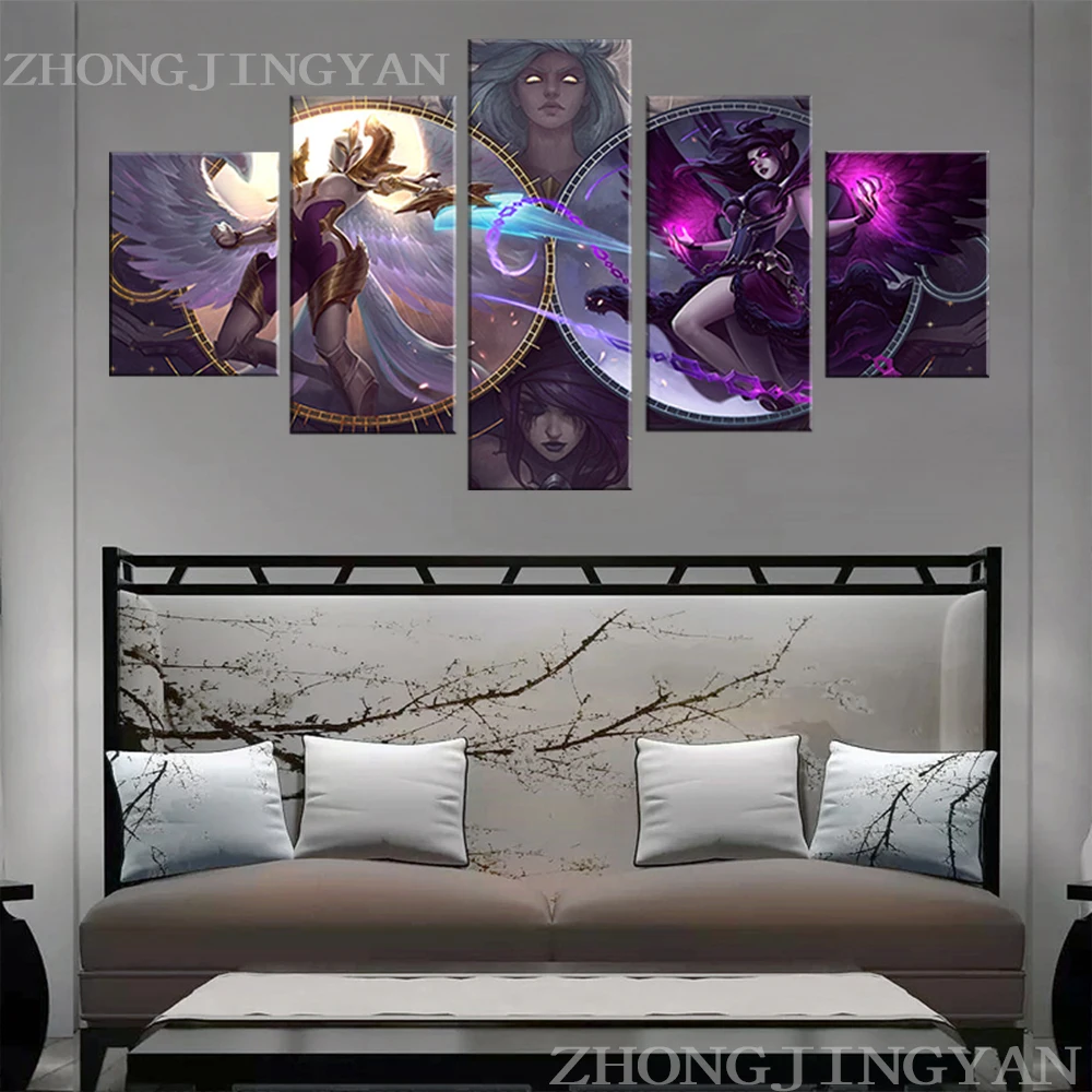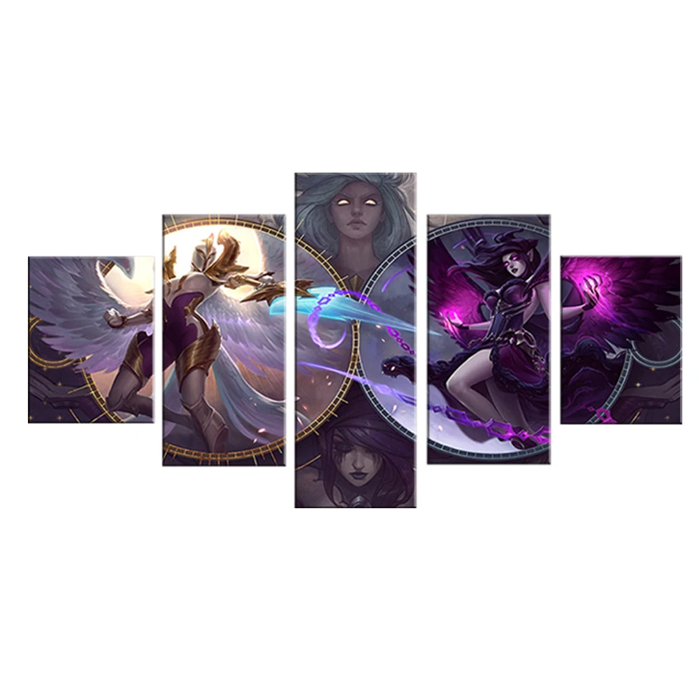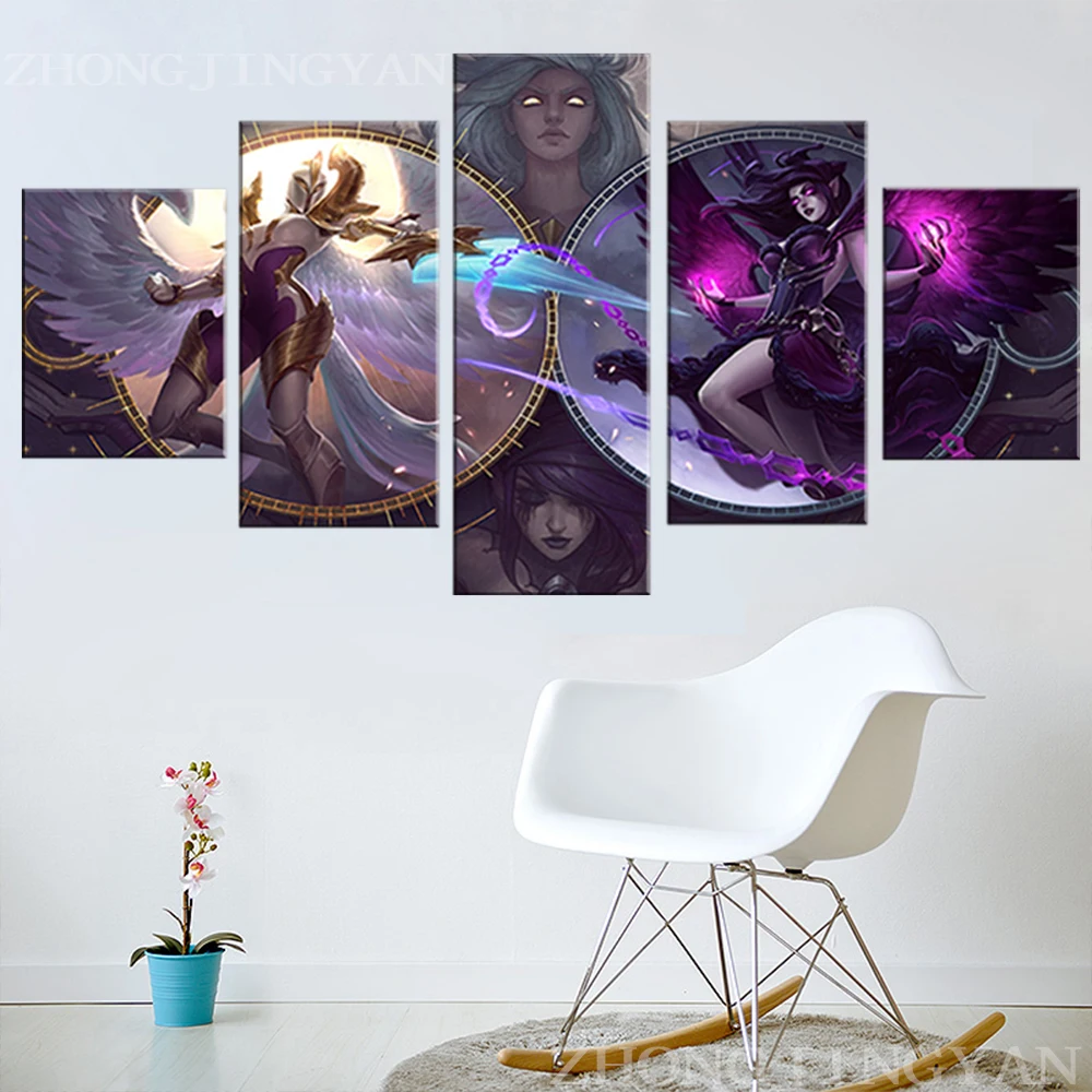 Картина на холсте, Декор для дома, 5 панелей, Morgana And Kayle League Of Legends, видеоигры, настенное искусство, модульные картины, плакат
