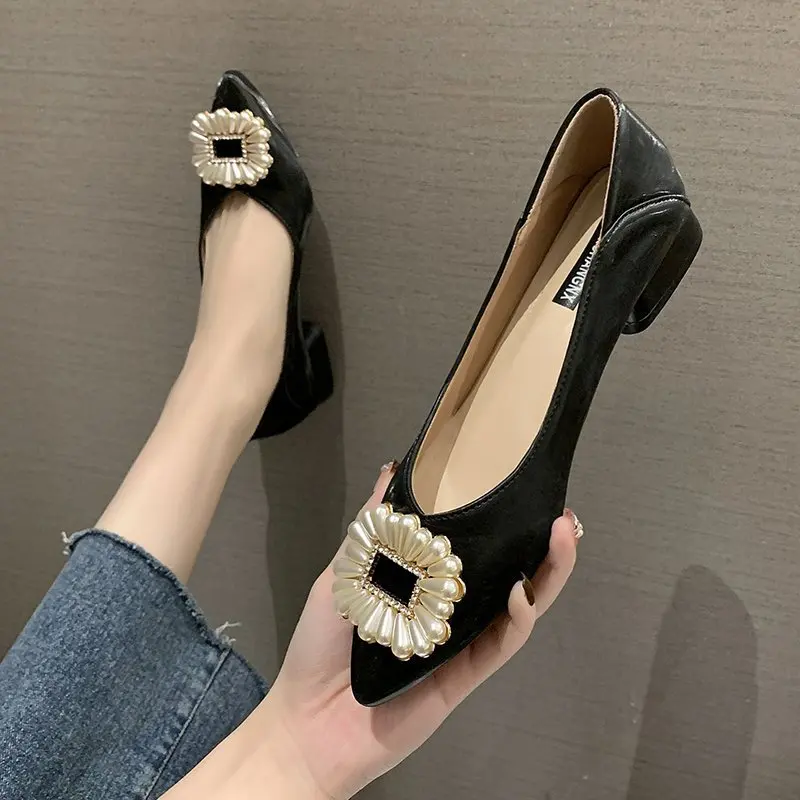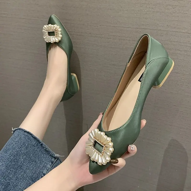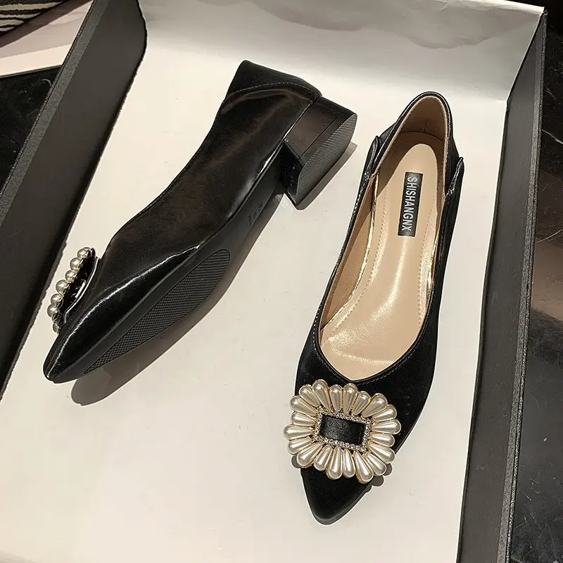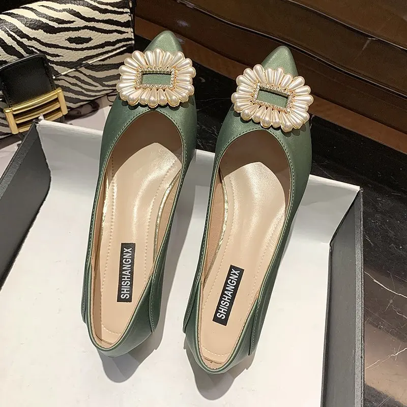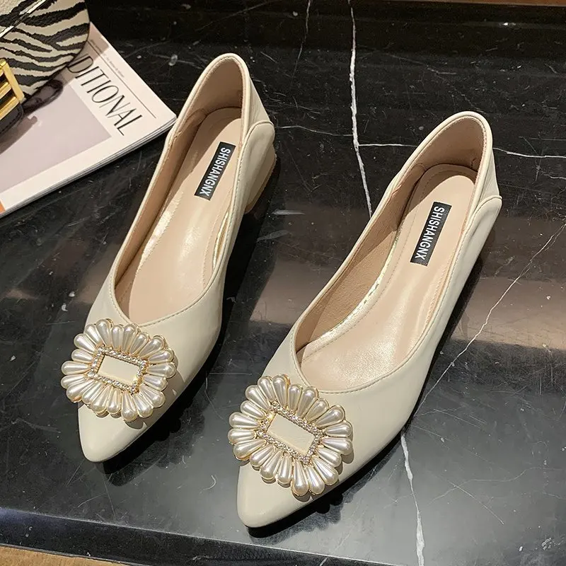 Туфли-лодочки женские на плоской подошве, заостренный носок, без застежки, кожа, жемчуг, кристаллы, офисная обувь, 8972N, весна
