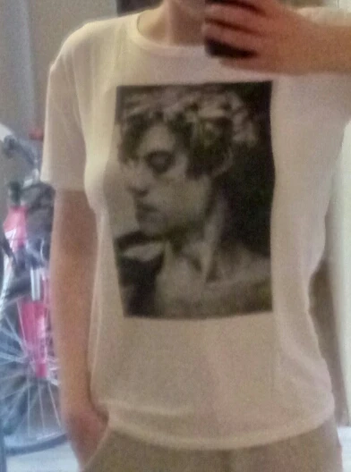 Майка очень приятного качества, но ткань совсем не плотная, немного эластичная. Принт четкий, как на картинке. Размер S на параметры 86 грудь 66 талия сел отлично. Шов на плечах немного спущен, но не критично. В целом, отличная майка.