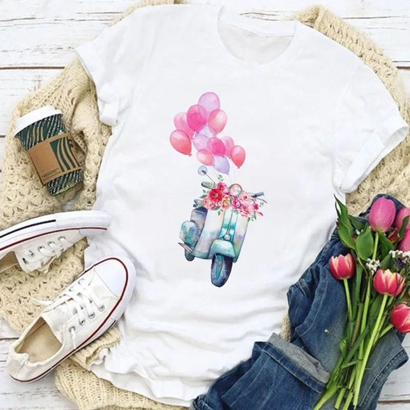 Женская футболка, модная женская футболка с коротким рукавом и цветочным принтом велосипеда, топы с графическим принтом, женская футболка