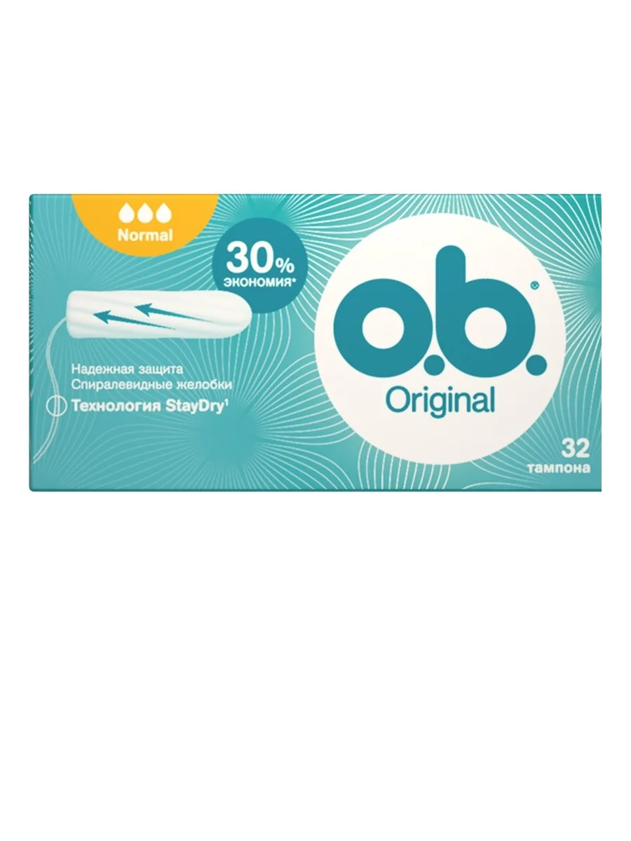 Тампоны o.b.® Original для твоей надежной защиты. Технология спираледных желобков обеспечивает более эффективное направление жидкости внутрь тампона, а технология StayDry (СтэйДрай) позволяет нити тампона оставаться сухой для дополнительного ощущения чистоты. o.b.® Original Normal рекомендованы при средних выделениях.