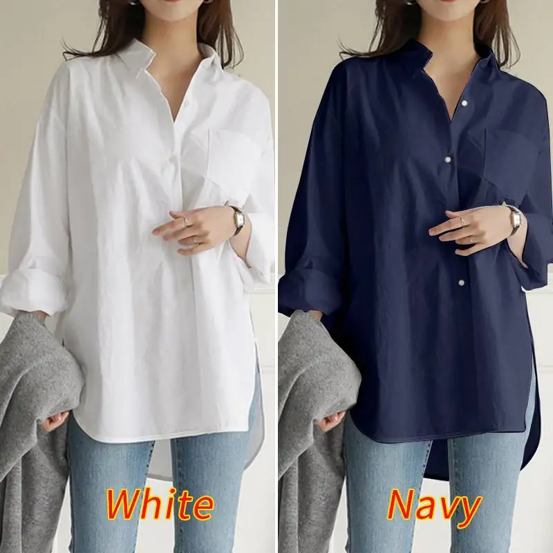 Женская Повседневная Свободная хлопковая однотонная блузка, рубашки, женская Стильная туника с разрезом сбоку, топы на пуговицах 7