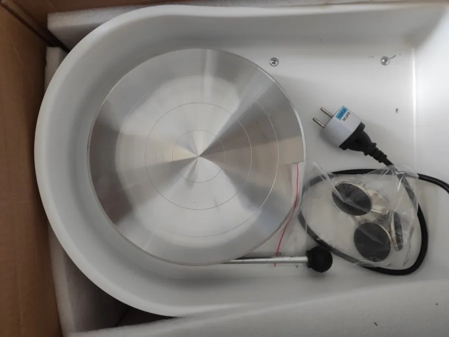 Заявленная мощность не соответствует действительности. Как видно на фото- всего 200 ватт. Диск гончарного круга установлен хорошо, ровно, но вот приводной шкив даёт небольшое биение, особенно при увеличении оборотов. Но вцелом для мастер классов подойдёт.
