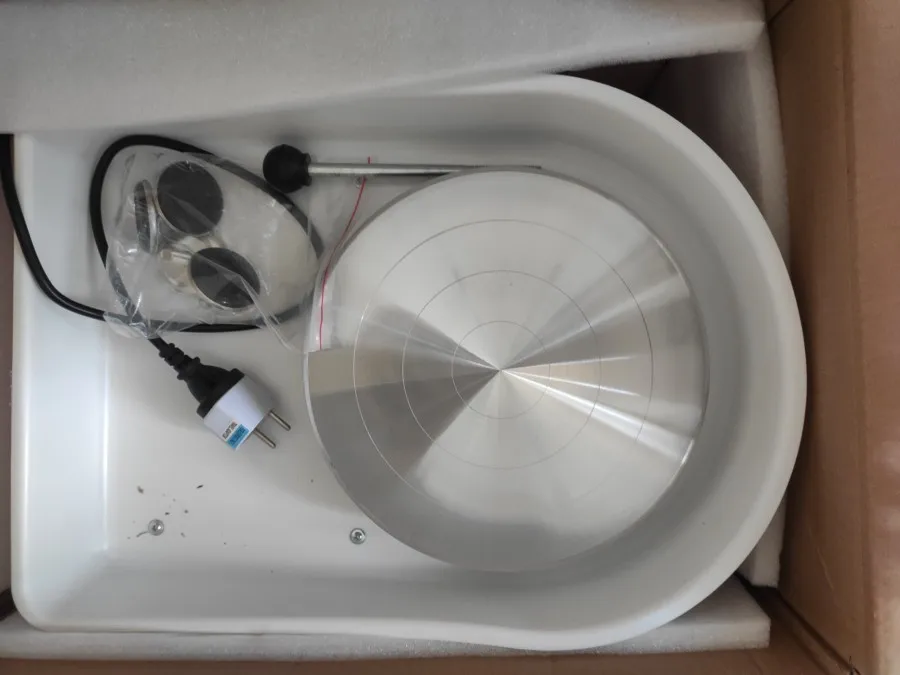Круг маломощный. Там всего 200 ватт, вместо 600 обещанных. Больше 1,5кг глины поднять на нем проблемматично - останавливается. Корыто несьемное. Педаль расхлябистая, и обратите внимание, вам придется приподнять круг т.к он слишком низко и тогда педалью не попользуешься, только рычагом. Второй раз я бы этот круг не покупал. Лучше выбрать другой вариант