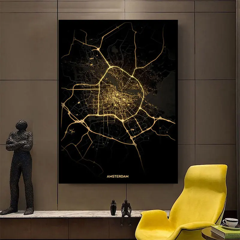 Черного и золотого цвета с изображением абстрактных линий Плакаты карта городов мира вход холст Картины для Гостиная печать дома украшение дома