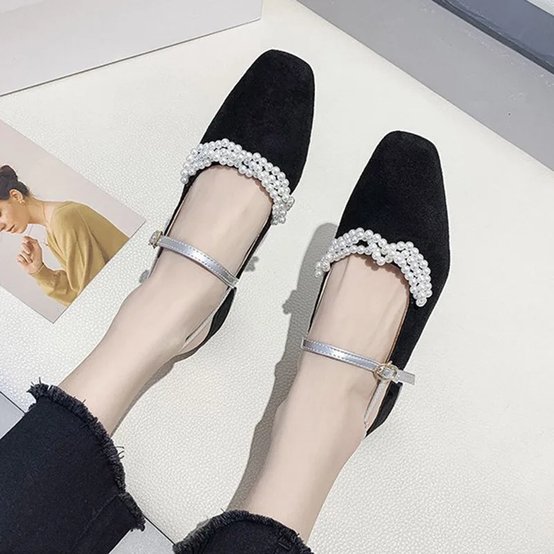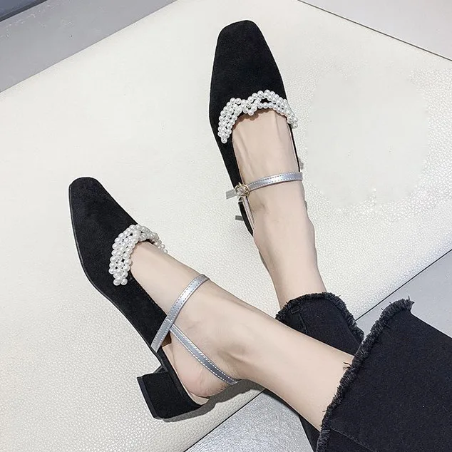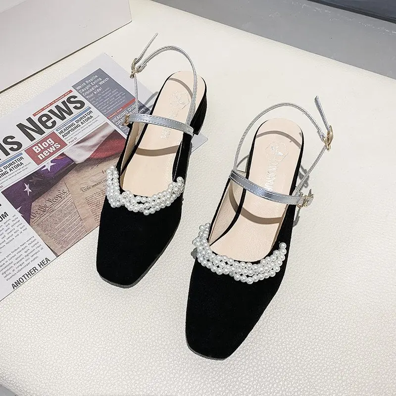 Женские босоножки с ремешком на пятке, туфли-лодочки с бусинами и жемчугом на среднем каблуке, весна-лето 2021