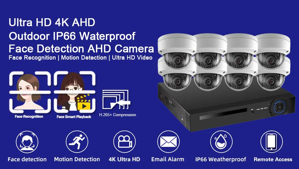 1, Ультра HD 4K дисплей высокой четкости, 6 в 1 гибридный цифровой видеорегистратор;2. Ультра HD 8MP AHD камера, металлический материал, IP66 водонепроницаемый, подходит для внутреннего и наружного использования; Пыленепроницаемый, надежный для домашней безопасности;4. Улучшенное H.265 Сжатие видео, подключи и работай, простая настройка;3. Поддержка распознавания лица, воспроизведения лица, обеспечивает ультра высокое разрешение видео наблюдения, обеспечивая максимальную детализацию и четкость доступны;4. Все камеры поддерживают расстояние передачи 500 метров, ночное видение до 30-40 м с умным ИК, четкое дневное и ночное видение с автоматическим ИК-излучением;6. Поддержка обнаружения движения, оповещения по электронной почте, воспроизведения видео и многоязычности;7. Поддержка Android,Iphone,Ipad,PC,VMS,P2P view;8. Удаленный доступ в любом месте, в любое время;