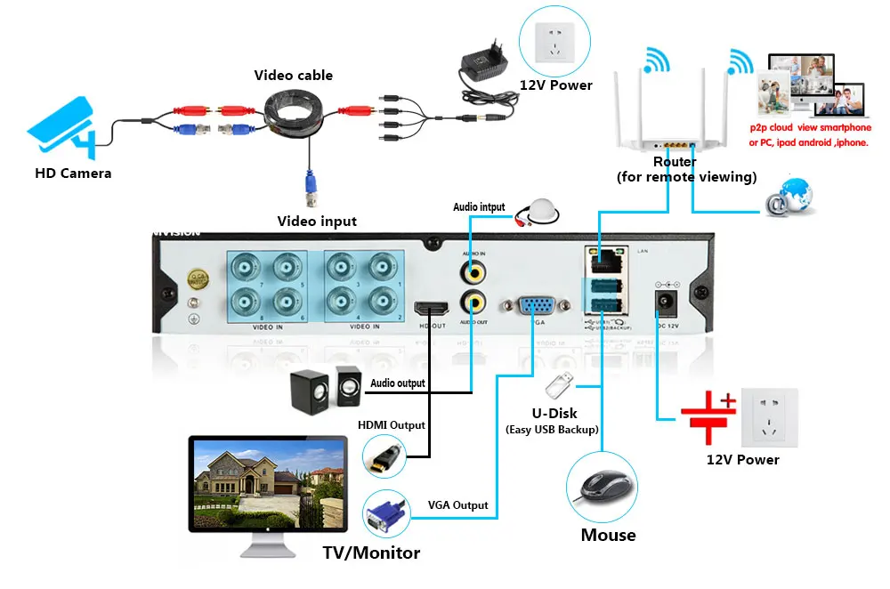 Простая настройка, всего 4 шага для просмотра мобильный телефон, просмотра видео в режиме реального времени из любого места и в любое время с помощью смартфона, стола или ПК с передовой технологией P2P, вы можете получить удаленный доступ к вашей системе за считанные минуты или меньше, нет необходимости в переадресации, удаленный доступ никогда не был таким простым!