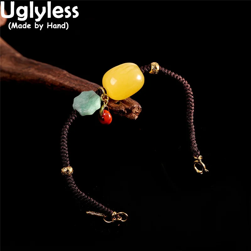 Uglyless простые веревочные браслеты для женщин натуральный янтарь из воска Жадеит браслет из настоящего серебра 925 пробы медаль-амулет Этнические украшения агат