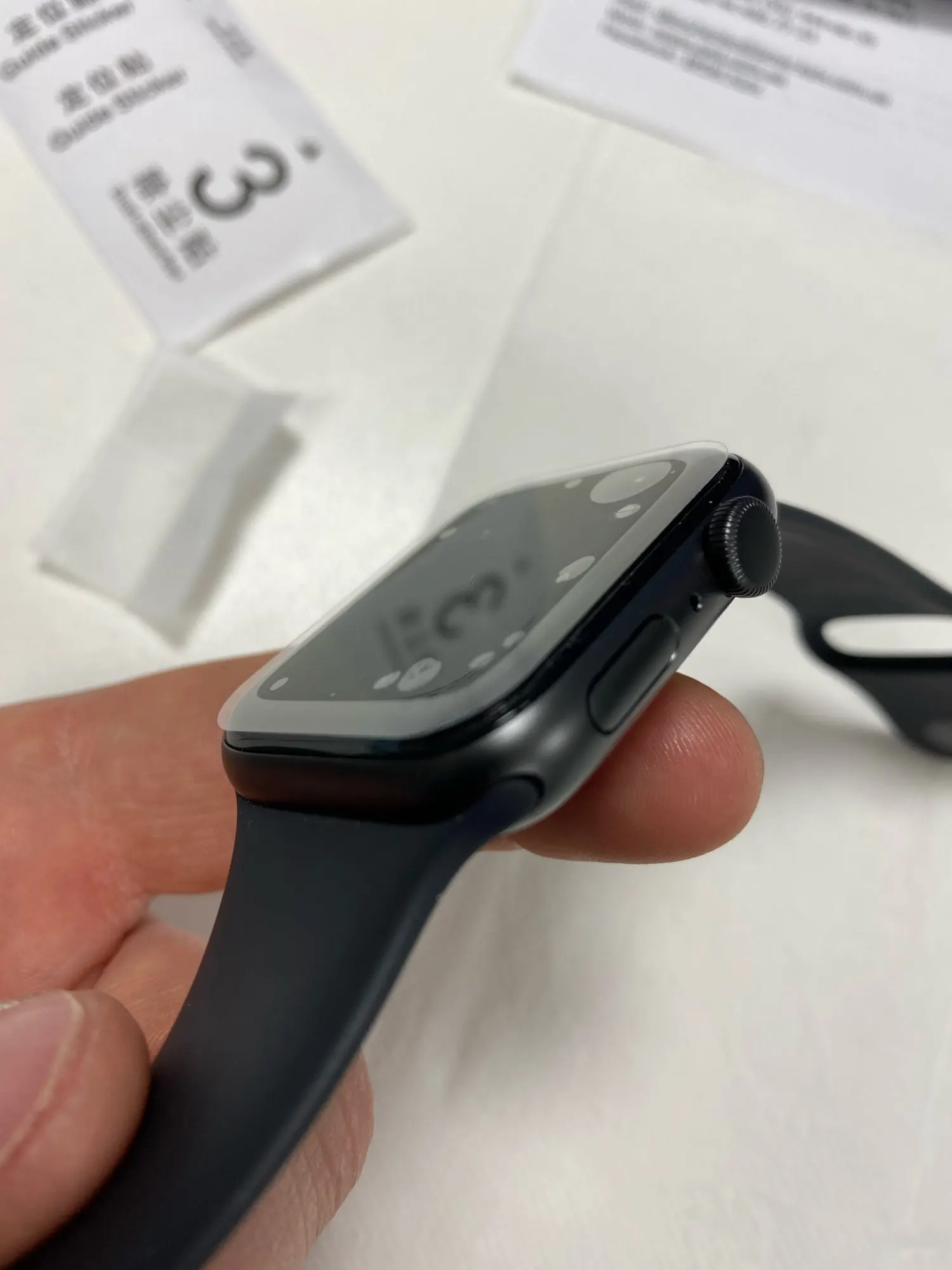 Почти не виден. Очень легко надеть на изогнутое стекло apple watch. Я очень доволен