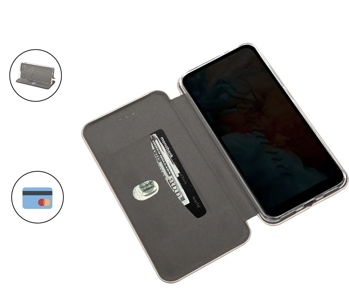 Как обычный чехол, только ещё и с крышкой. В отделении для карт ты можешь хранить хоть кредитку, хоть банкноты - выбор неограничен. Крышка легко превращается в подставку, благодаря которой становится очень удобно смотреть сериалы. Силиконовый держатель не бьётся и не деформируется, поэтому можно не бояться за сохранность своего телефона. Встроенные в крышку с двух сторон магниты, обеспечивают фиксацию крышки, но не оказывают влияние на функционал смартфона.