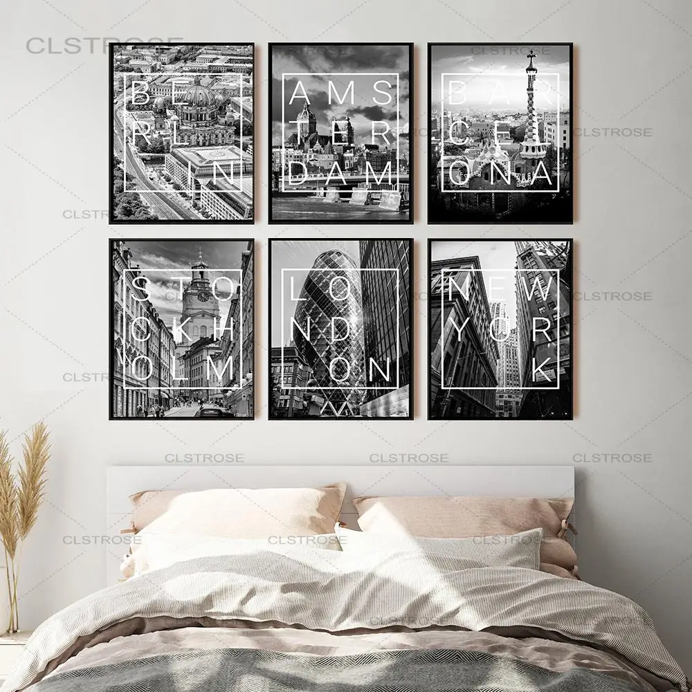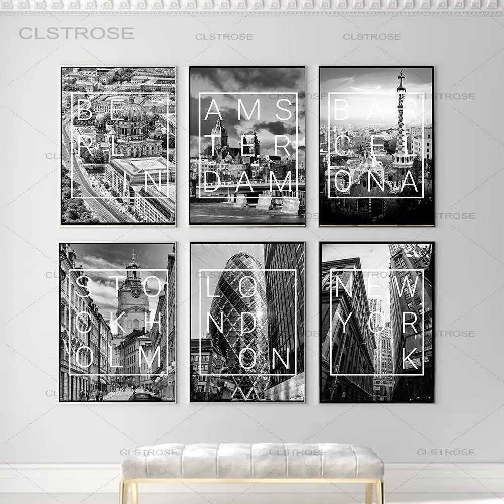 Холст Амстердам, лондонские плакаты и печать, черно-белые настенные художественные картины для дома, Нью-Йорк, Стокгольм, Барселона, декор для гостиной