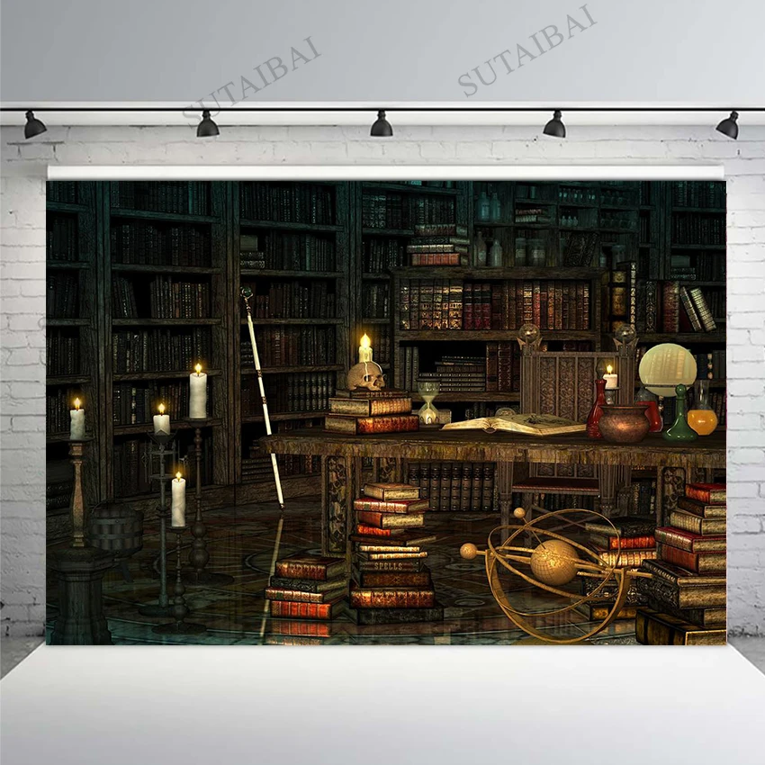 Волшебник, магия фон для фотосъемки с книжной полкой в стиле Хэллоу...