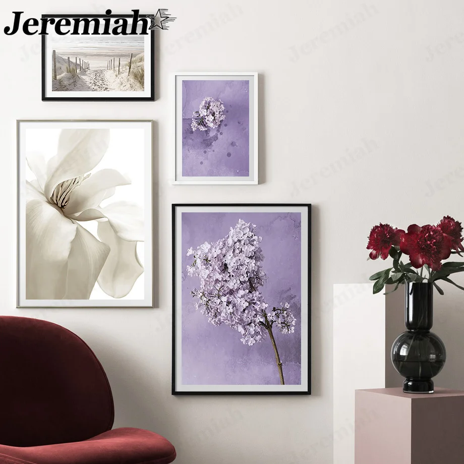 Постер на холсте с фиолетовыми цветами, простой плакат на пляже, лилия, картина Магнолия, настенное искусство, в скандинавском стиле, украшение для дома и комнаты