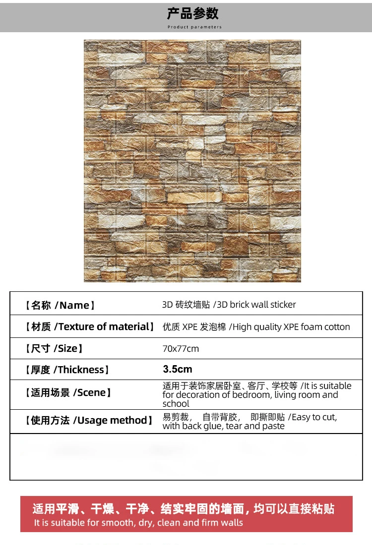 Особенность продукта 1: трехмерное мягкое украшение из пеноматериала, предотвращение столкновения детей, забота о семье. 2: защита окружающей среды, отсутствие специфического запаха, предоставление семье подходящего домашнего пространства. 3: реалистичный эффект, эффект естественного узора кирпича, простой современный стиль. 4: Бесплатный самоклеящийся дизайн, простая установка, случайный коллаж и произвольная резка. 5: по сравнению с обоями, он обладает лучшей звукоизоляцией и эффектом шумоподавления. 6. Размер изделия: 70 см * 77 см * 3,5 мм Способ установки и подготовка инструментов: клейкая поверхность чистая и аккуратная, с адгезией, Такие как: деревянная поверхность, стеклянная поверхность, беспылевая поверхность стены, поверхность стены с шпатлевкой и т. д. Паста: Оторвите бумагу с задней крышки и приклейте ее. Вспомогательные инструменты: ножницы, универсальный нож