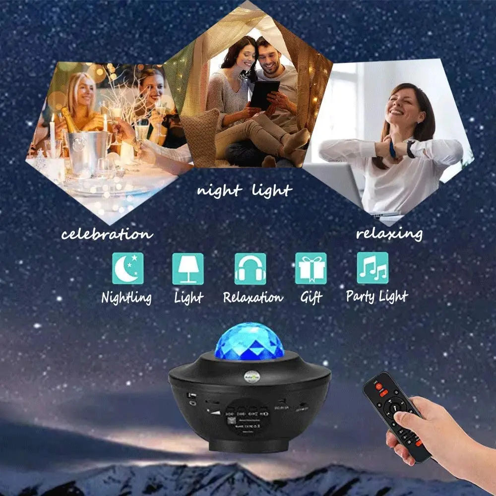 ♥【Создание фантастического звездного неба 】 - 2020 новый модернизированный Звездный проектор создает фантазию и красивые огни на потолке комнаты, звездное небо с океанской волной, чтобы предложить романтическое и мечтательное, как личное пространство для вас, принести мир и привести к качественному сну, стимулируя астрономические интересы детей. (Бесплатный мобильный телефон кронштейн и брелок для пальцев скейтборда.)♥【Голосовое управление звездным проектором-Особенности передовой технологии распознавания речи, наш Звездный проектор светильник мерцает с ритмом музыки или голоса, что создает лучшую атмосферу, когда у вас вечерние отношения с друзьями, просто Освободите себя.♥【 Встроенный HIFI динамик и таймер-звездный проектор с Bluetooth-совместимой функцией динамика позволяет вам нравится на концерте, вы можете подключить ваш iPod, iPad, смартфон совместим с Bluetooth, чтобы наслаждаться музыкой. И таймер 1 ч/2 ч для вас, чтобы легко установить время воспроизведения.♥【Несколько эффектов управления-вы можете выбрать режим океанской волны или звездной проекции или оба в соответствии с вашими предпочтениями, изменяя различные цвета/скорость/яркость волнового светильник, регулировка музыкального режима/громкости/звукового режима, чтобы показать расслабляющий Волшебный мир, пульт дистанционного управления включен для легкого управления. (Примечание: пульт дистанционного управления является инфракрасным пультом дистанционного управления, пожалуйста, обратите внимание на положение Приема Инфракрасного)♥【Без риска покупк】-Мы так уверены в нашем Звездном прожекторном светильник, что у нас нет проблем с возвратом или бесплатной заменой, если есть какие-либо проблемы с нашим звездным светильник s, не стесняйтесь связаться с нами для проблемы, и мы решим проблему в течение 24 часов.