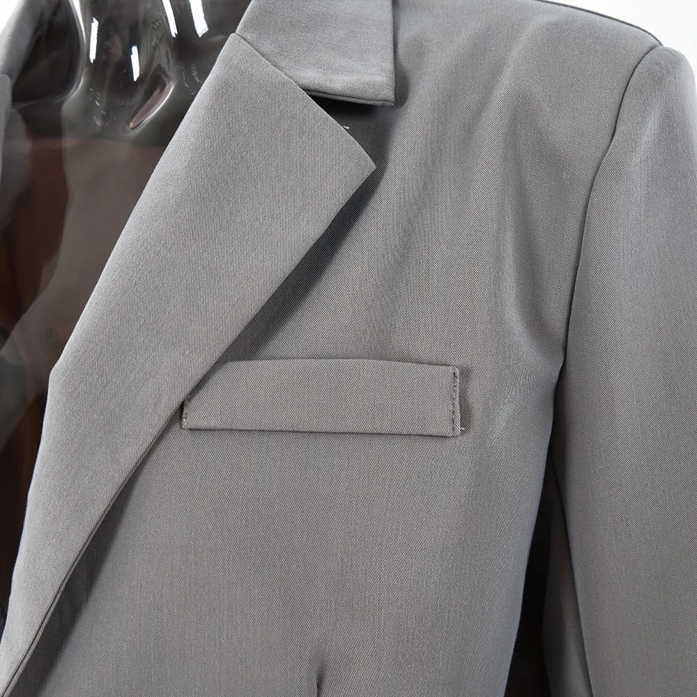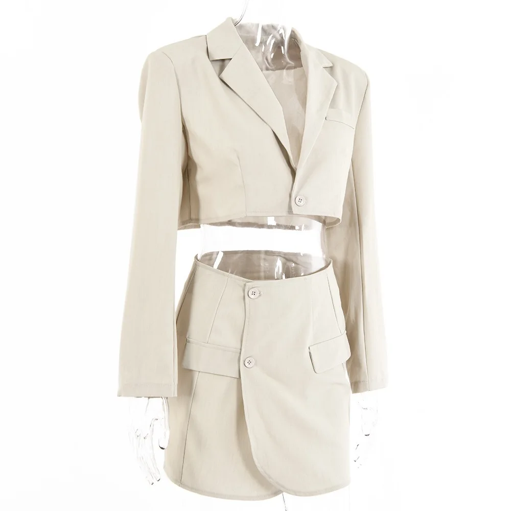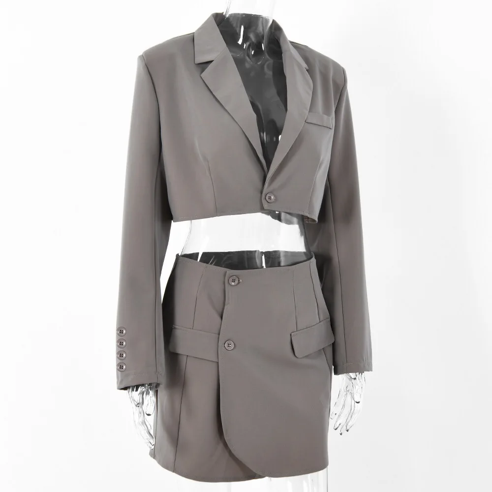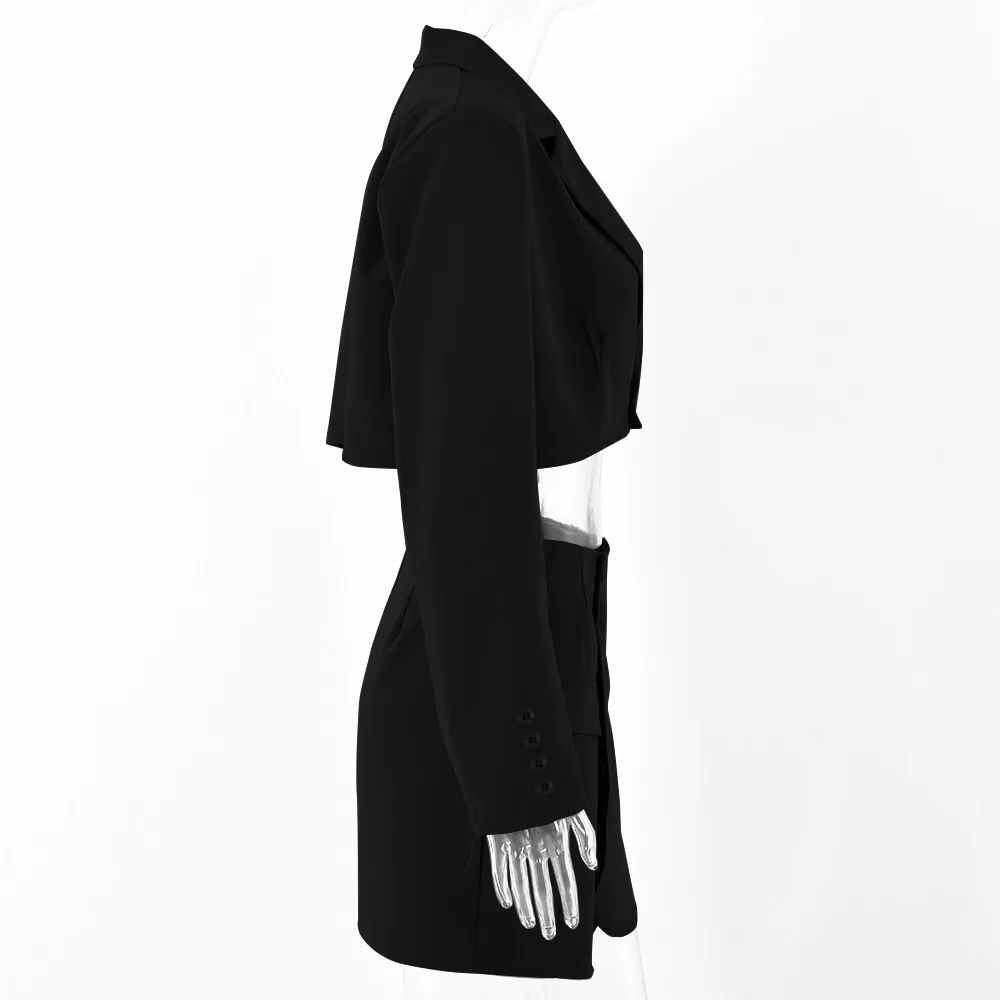 Женский винтажный костюм из 2 предметов, короткий Блейзер на одной пуговице с высокой талией, юбка мини с перекрестными разрезами и длинным рукавом