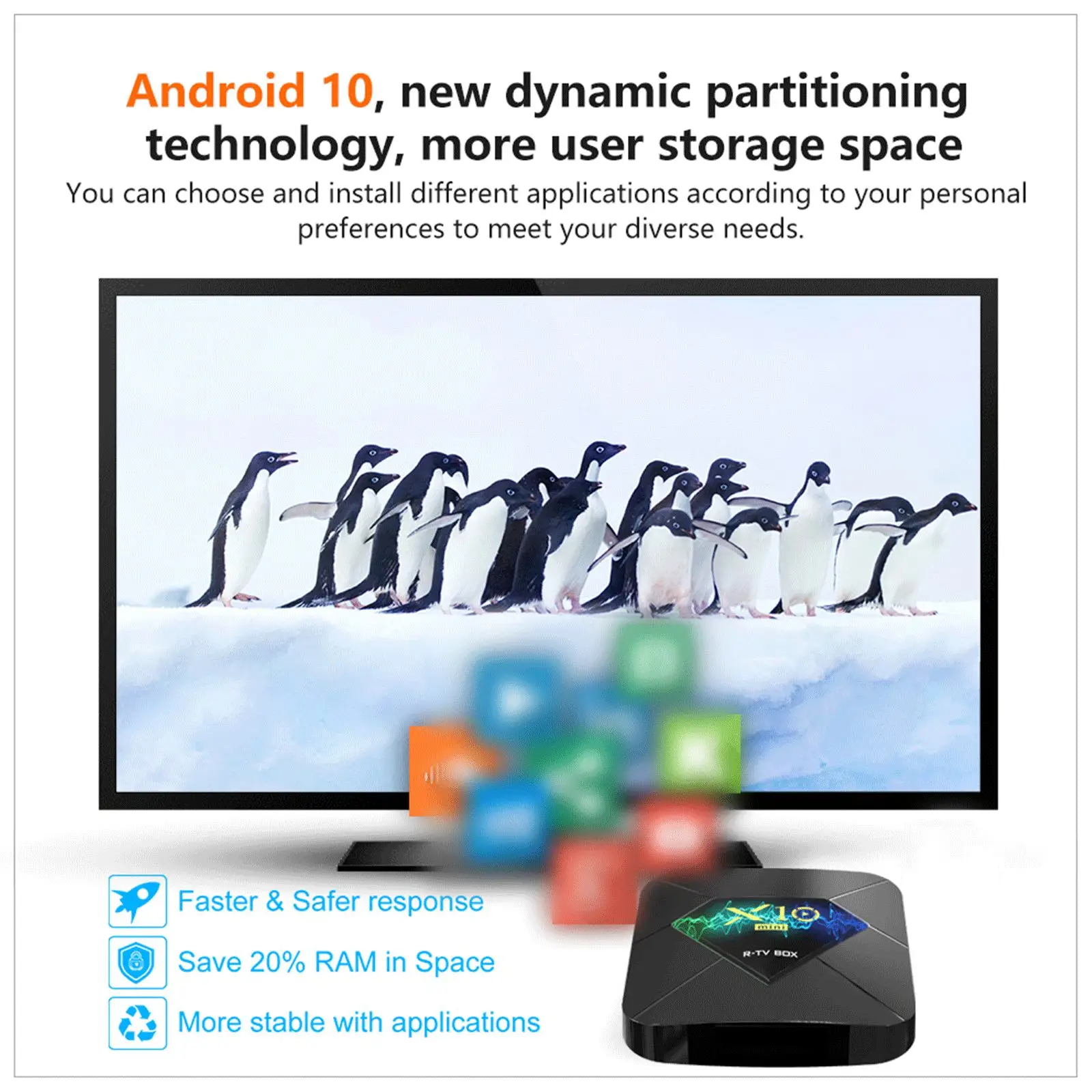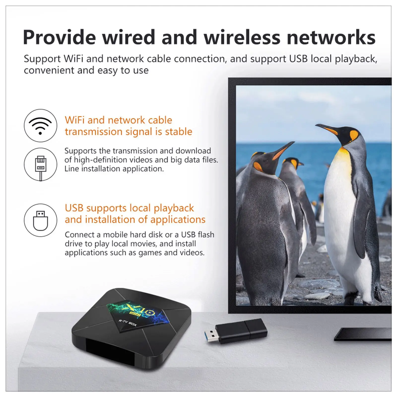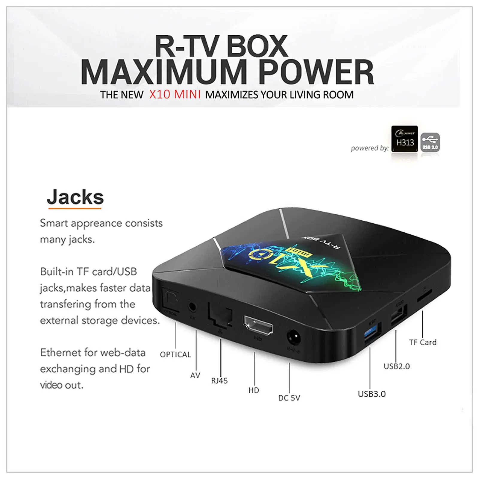 X10mini Smart Android TV Box может изменить ваш традиционный телевизор и ЖК-монитор в мультимедийный центр, подключив интернет (через WiFi или RJ45). Этот умный Android ТВ коробка в такой обуви вы будете чувствовать себя много удовольствия и удобства благодаря мощному особенность: Android 10,0, процессор Allwinner H313 64-разрядным четырёхъядерным чипсет, Cortex-A55 Процессор, 1 + 8G/2 + 16G и BT4.1. Просто подключите его к телевизору, и вы готовы к работе!