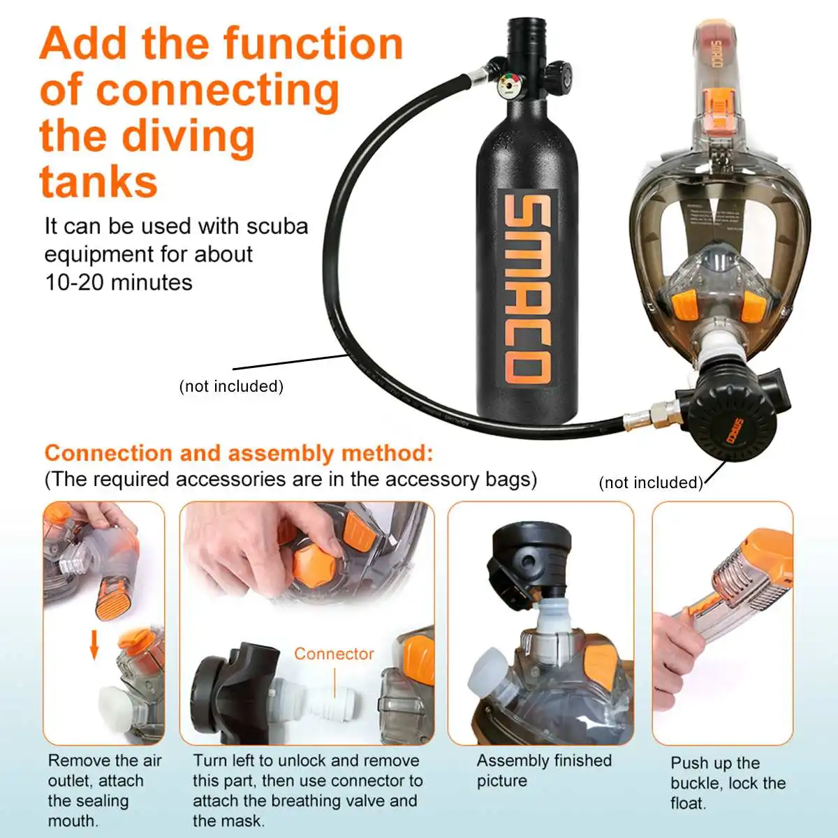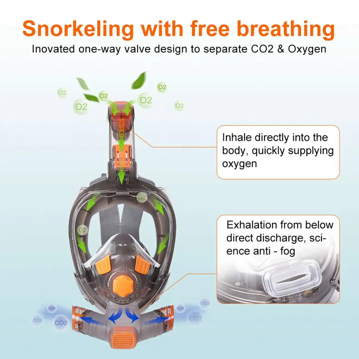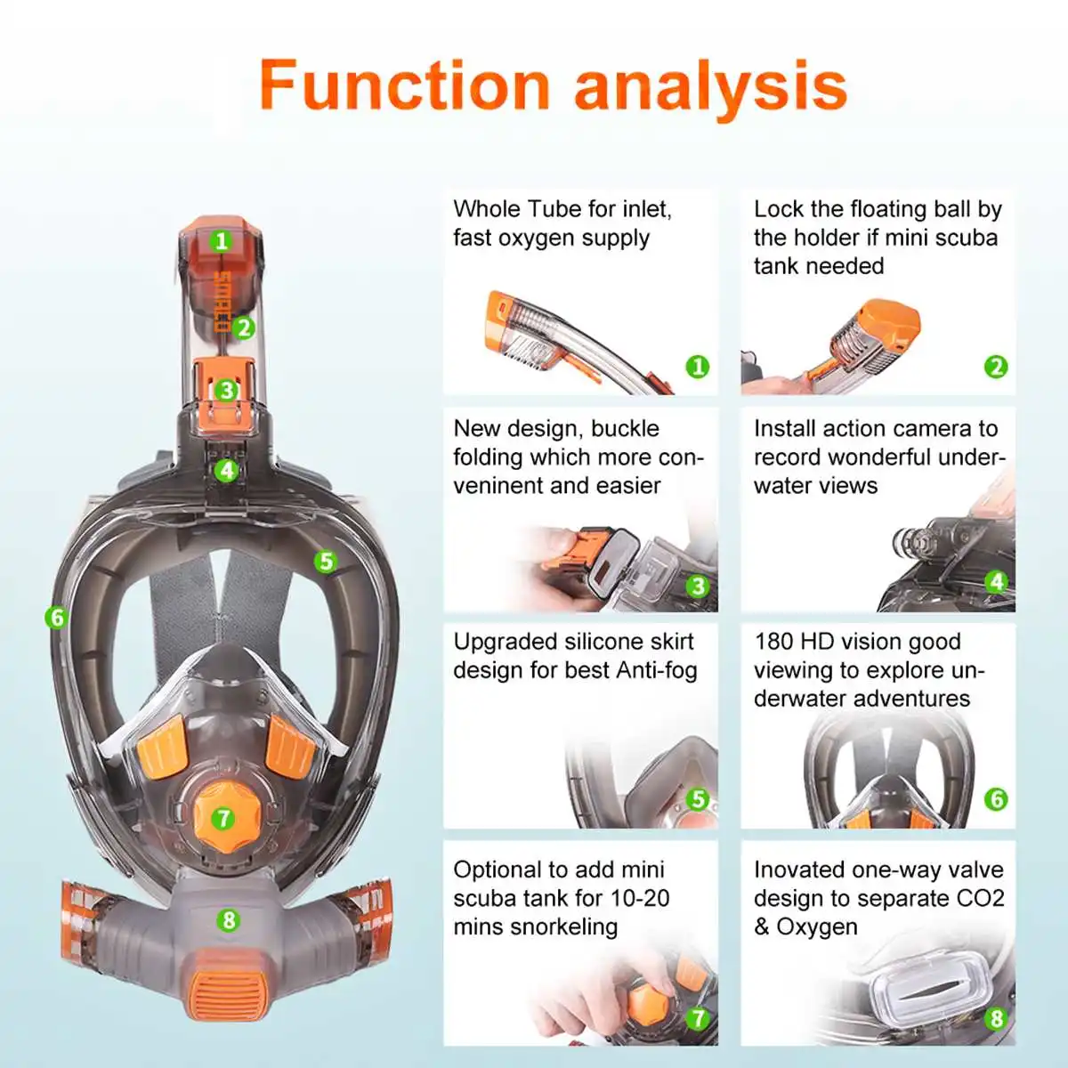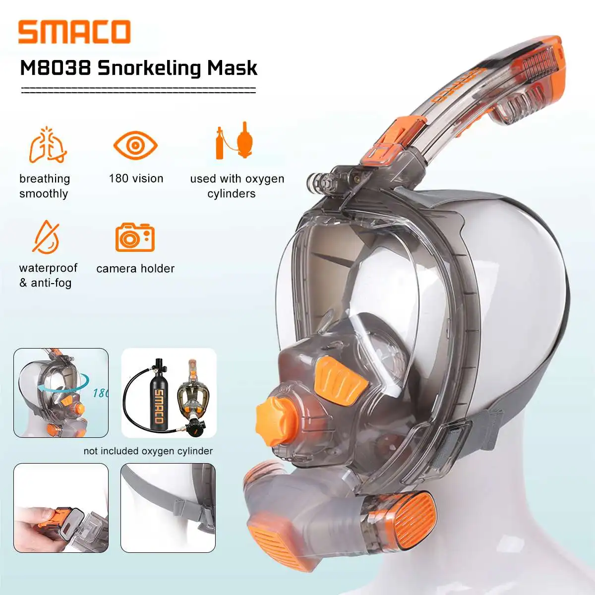 Особенности:-Водонепроницаемость и защита от запотевания.-Компактный портативный легкий, легко носить с собой.-Может использоваться с кислородным баллоном S400 (не входит в комплект)-Экологичный Мягкий силикон для более комфортного ношения.-3D изогнутая Полнолицевая маска с широким диапазоном обзора 180 °, взрывозащищенное HD-зеркало.-Гибкая тканевая повязка на голову, легкое одевание, регулируемый эластичный текстильный ремешок, который не вытягивает волосы.