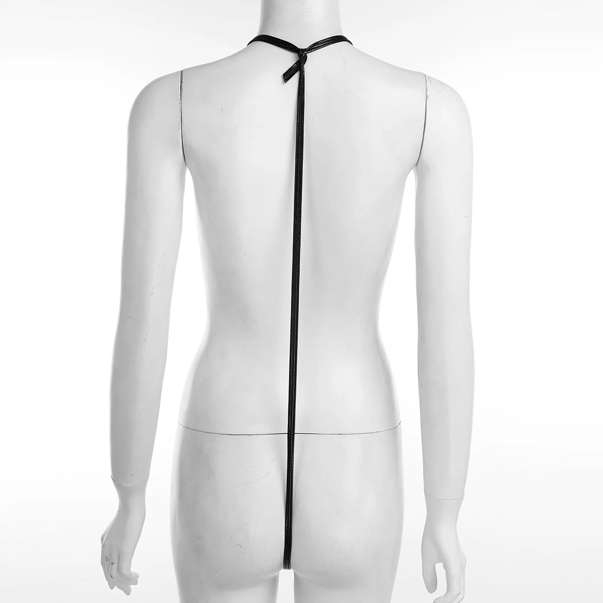 Женское нижнее белье из лакированной кожи. Вырез на шее, открытый бюст, глубокий v-образный вырез спереди. С открытой спиной и без косточек; С завязками сзади на шее. Глянцевый внешний вид, плотно прилегающий и привлекательный. Идеально подходит для ночного белья или для самостоятельного удовольствия. Один размер: От шеи до паха: 74 см/29,0 дюйма