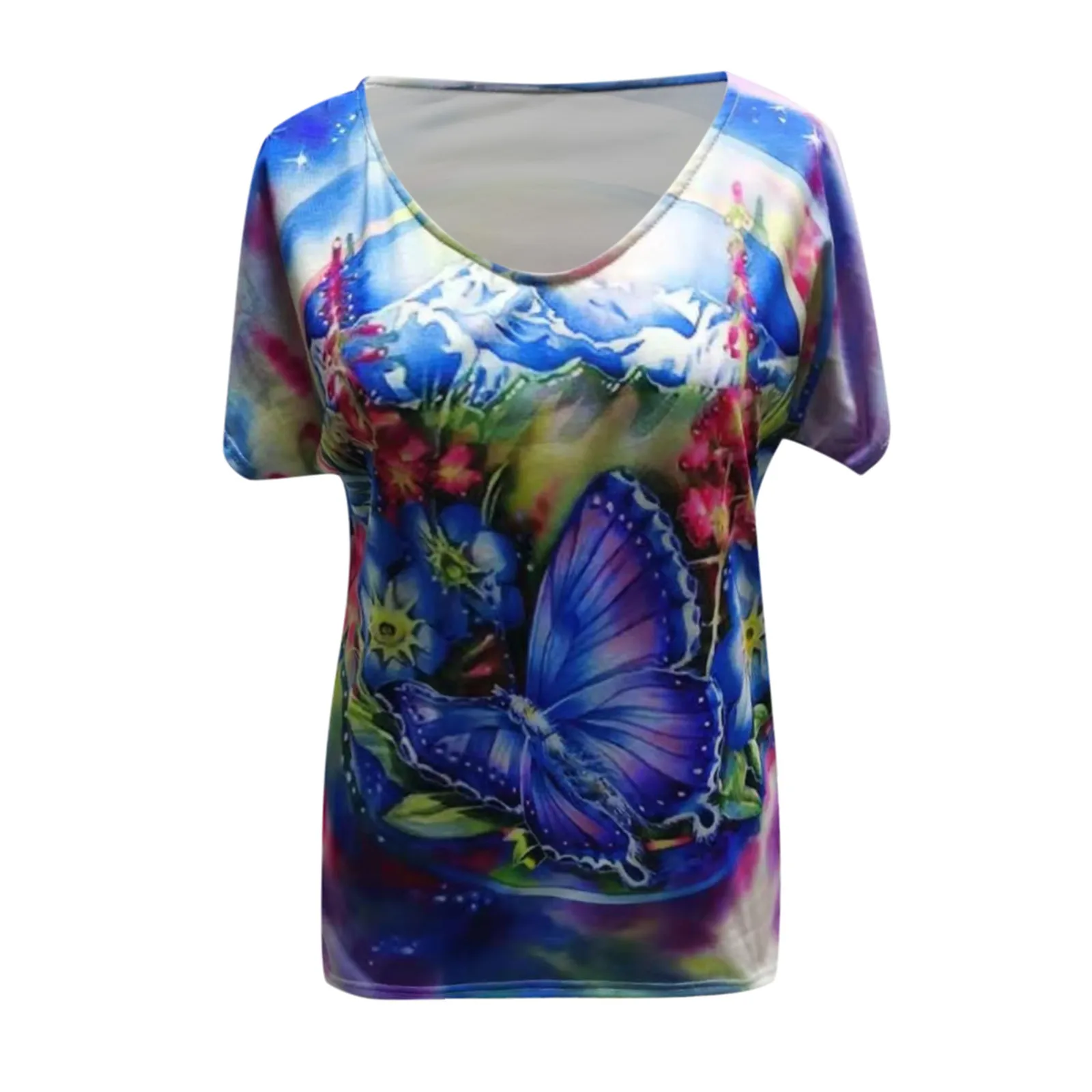 Женская футболка с принтом в виде павлина, с коротким рукавом и V-образным вырезом, с рисунком бабочек, в винтажном стиле, @ 40, размера плюс