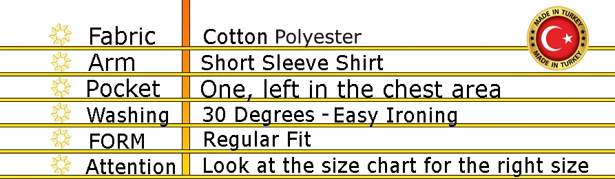 Содержание: 67% хлопок 33% полиэстерМужская рубашка с коротким рукавом с одним карманомСделано в ТурцииПожалуйста, внимательно изучите таблицу размеров, чтобы найти правильный размер для васДиапазон веса, указанные в таблице, на рост 1,75.Или если вы сообщите нам свой рост, вес и размер области живота, мы подскажем вам подходящий размер.Мы ответим на ваши сообщения в течение 10 минут