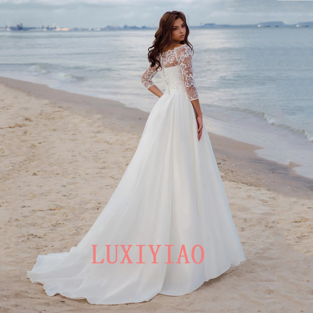 Роскошное Свадебное платье LUXIYIAO LO27, 2022 г., с длинными рукавами и круглым вырезом, кружевное атласное ТРАПЕЦИЕВИДНОЕ свадебное платье со шлейфом для невесты