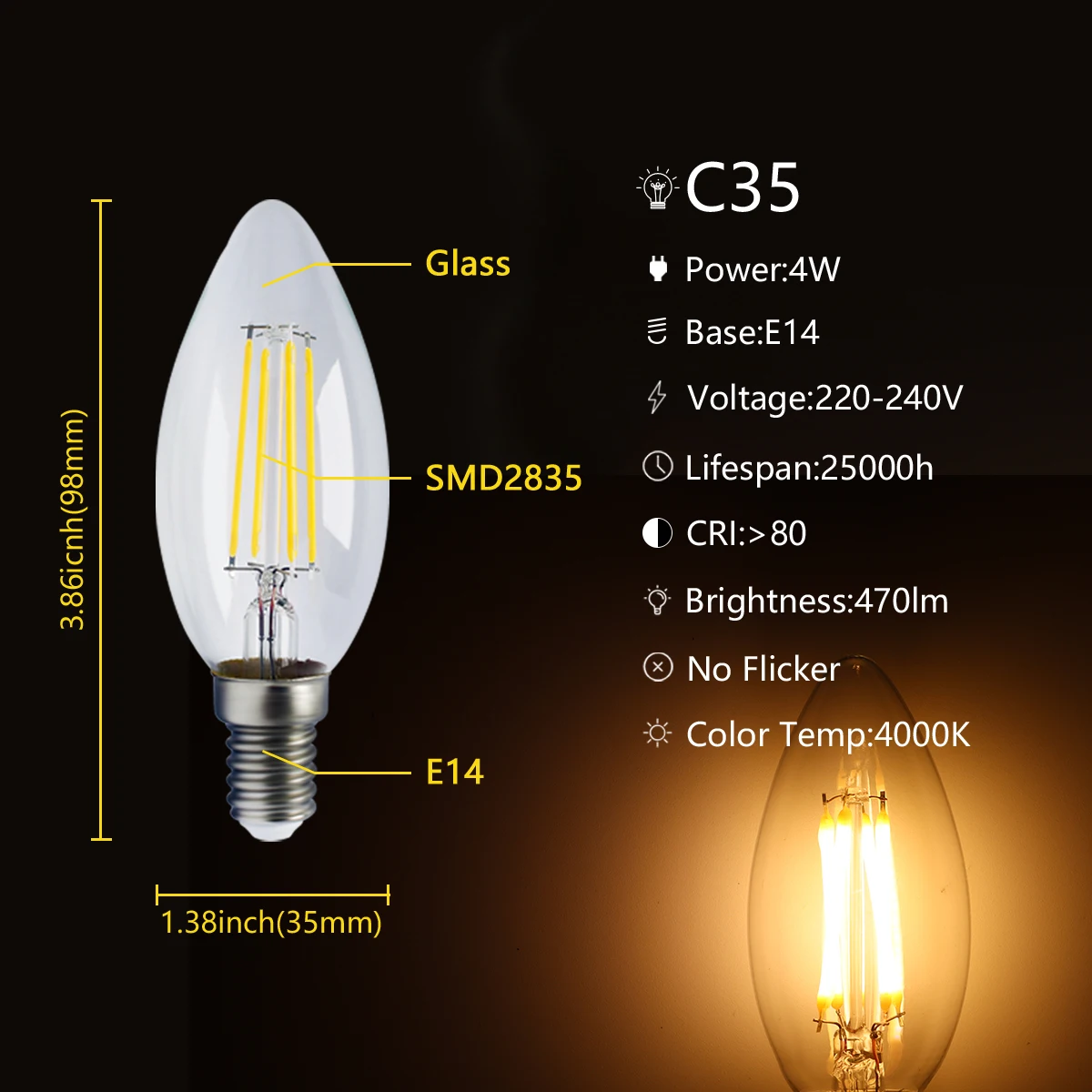 Лампа накаливания Эдисона, 4 Вт, 6 шт.лот, C35, Е14, 220-240 В, 4000 к