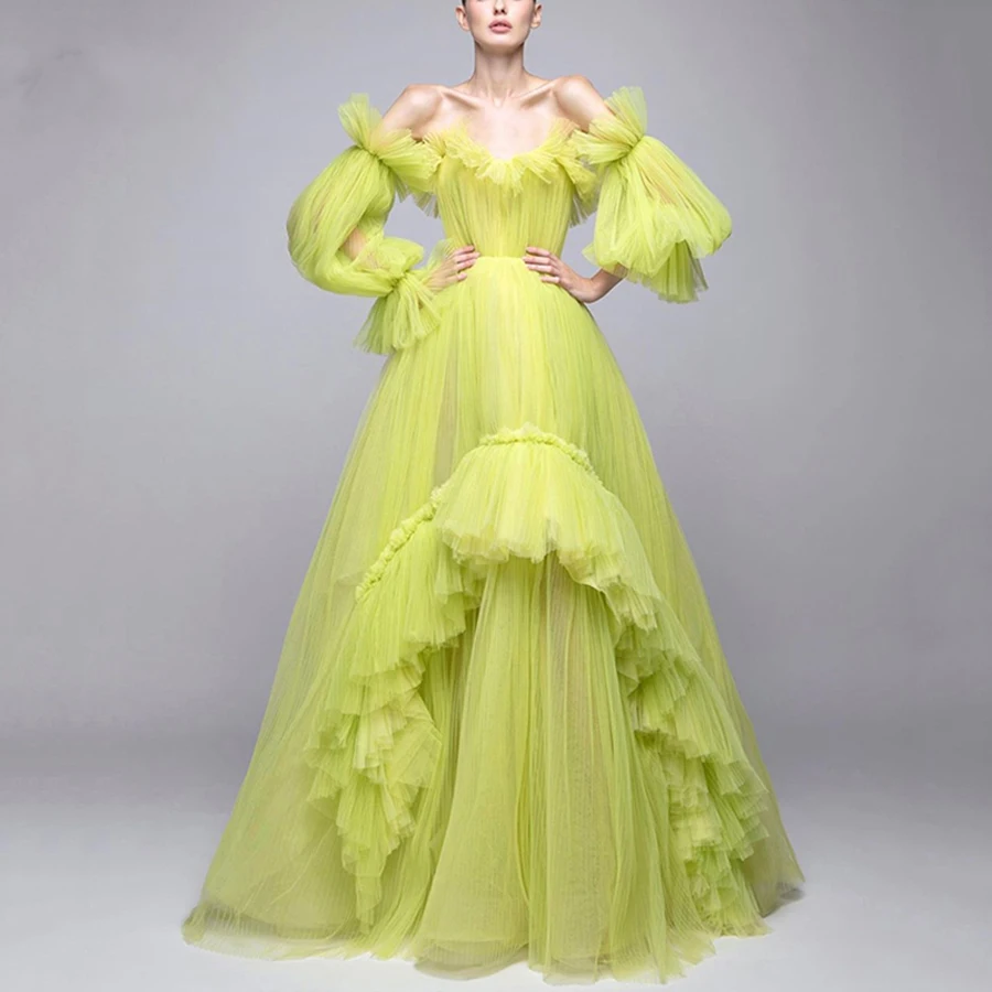 Неоново-зеленые пышные платья для выпускного вечера с расклешенными рукавами пышные официальные платья из тюля с оборками Вечерние платья с открытыми плечами длинное платье