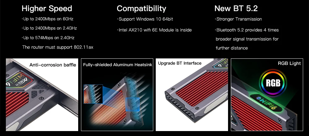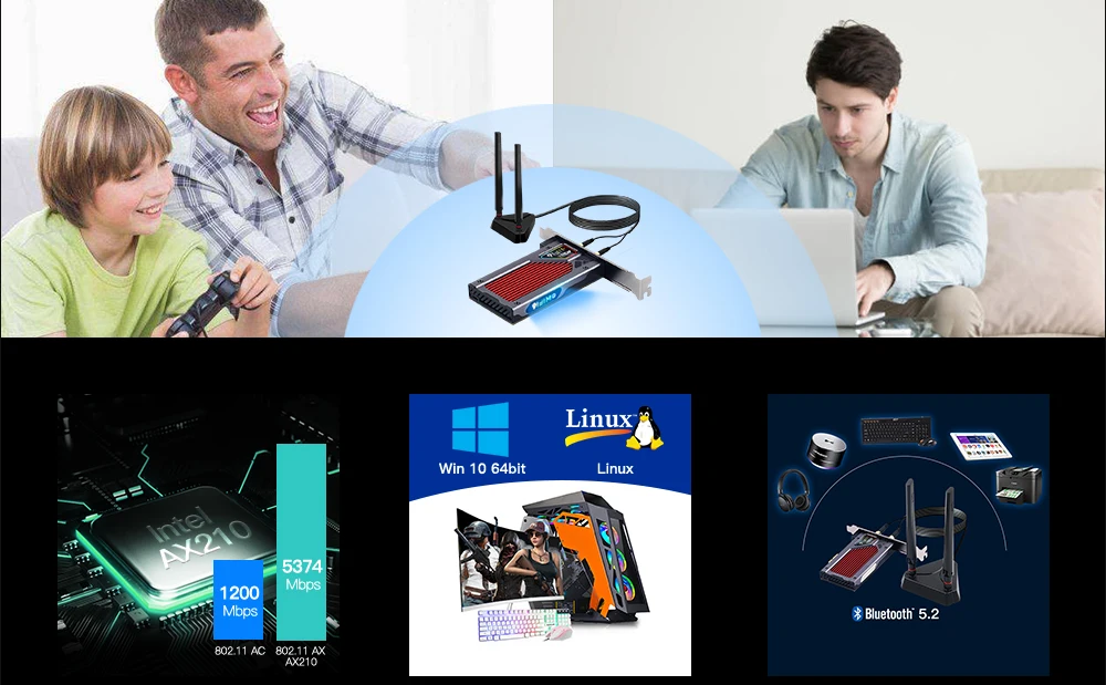 Сетевая карта Wi-Fi Fenvi 6e, Intel AX210, PCIe, Bluetooth 5,2, AX210NGW, 2,4 ГГц5G ГГц, RGB AX200, BT5.1, 802.11ax