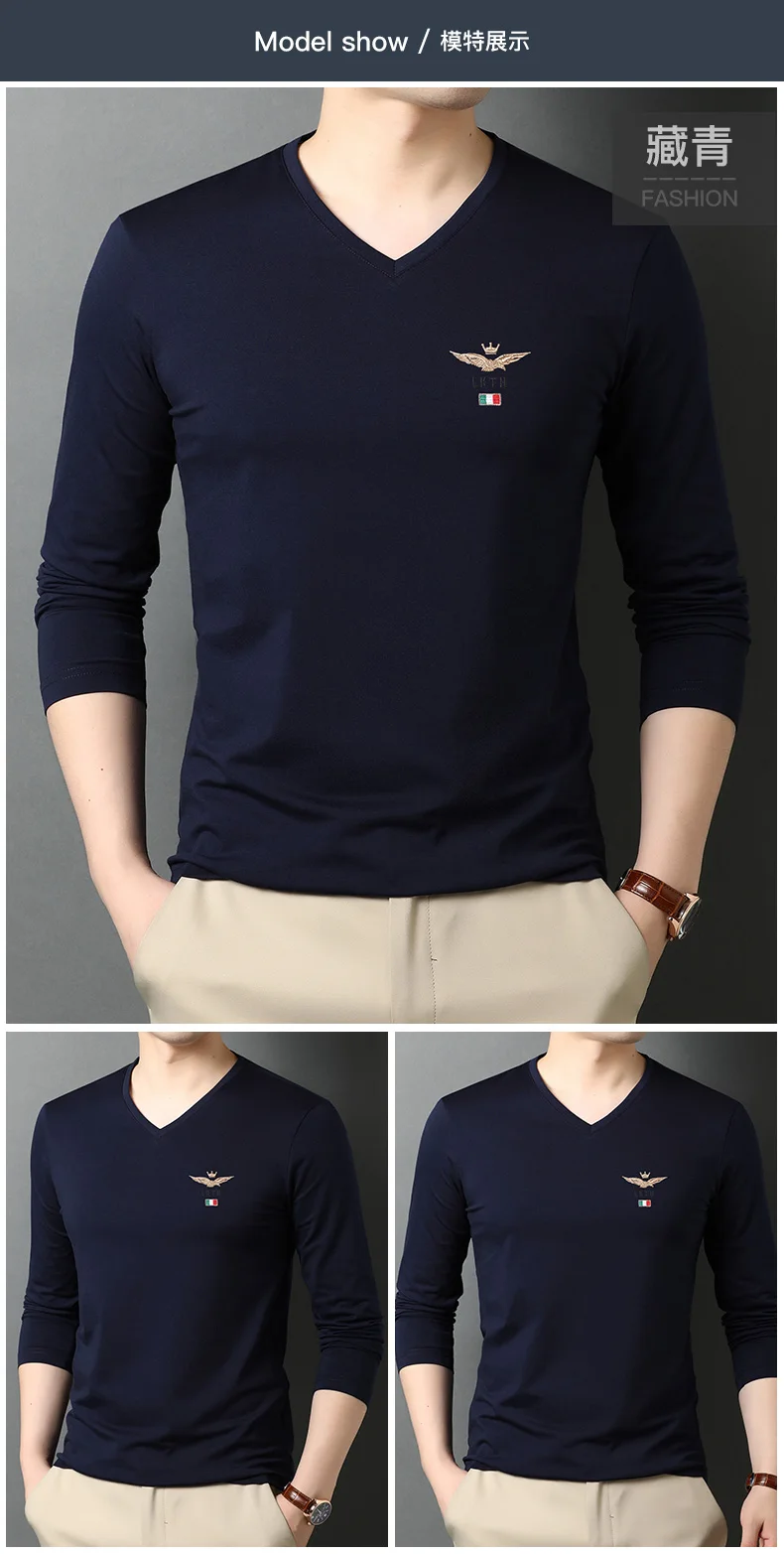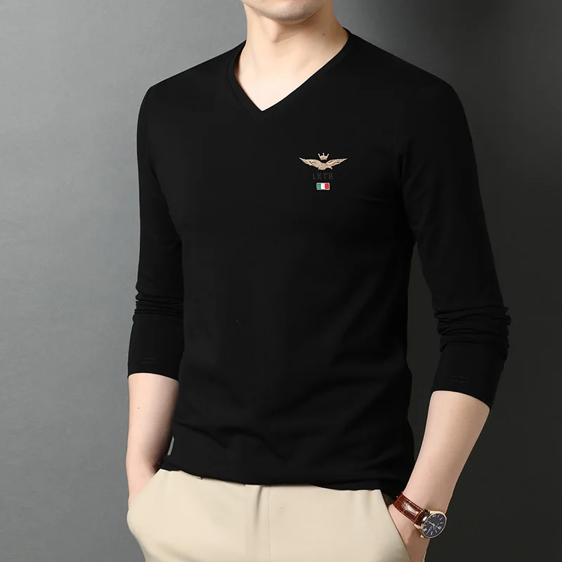 Мужская футболка с длинными рукавами, повседневная однотонная черная футболка из 95% хлопка, 5% спандекса, с V-образным вырезом, 2022