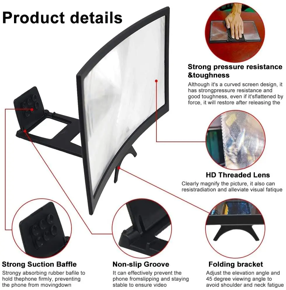 Описание:Это недавно разработанный мобильный телефон с изогнутым экраном. Он принимает новый дизайн изогнутой дуговой рамы + 12 дюймовые акриловые линзы высокой четкости. Наслаждаясь большим видео-изображением, он также имеет больший угол обзора, и вам больше не нужно поддерживать осанку просмотра. Даже если вы поворачиваетесь влево и вправо, чтобы увидеть, увеличенное изображение остается четким и высоким.Характеристика:-Резьбовое Зеркало высокой четкости, прозрачный увеличитель для экрана телефона, устойчив к излучению и снимает усталость зрения.-Противоскользящий слот эффективно предотвращает скольжение мобильный телефон и удерживает его в вертикальном положении.-Твердая перегородка на присоске может надежно удерживать мобильный телефон и не допустить его перемещения.-Хотя он имеет изогнутый дизайн экрана, он обладает сильным сопротивлением сжатия и хорошей прочностью.-Освободите руки, настройте удобную перспективу и Позаботьтесь о здоровье шейки матки.Спецификация:Материал изделия: абс + ПММАРазмер продукта: 250*160*20 мм/9,84*6,30*0,79"Цвет изделия: черныйЦвет линзы: синийПримечание:1. Возможны незначительные отклонения в размере из-за ручного измерения, различных методов измерения и инструментов.2. Изображение может не отражать фактический цвет изделия из-за различных фотографирования светильник, угол и дисплей монитора.Упаковка:1 X увеличитель для экрана телефона