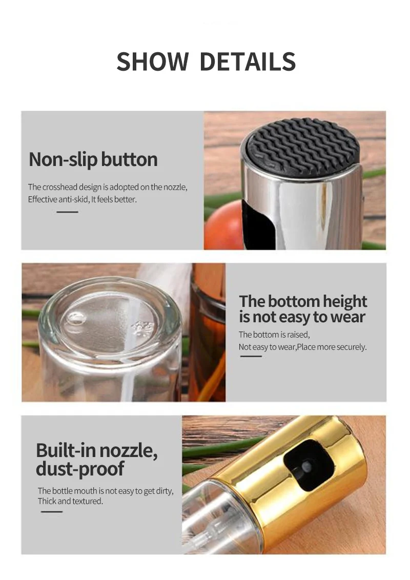 Особенности: Высококачественное качество-изготовлено из высококачественной нержавеющей стали и стекла, без BPA и экологически чистые, 100% степень безопасности пищевых продуктов. Умный дизайн прозрачного стеклянного горшка, вы можете легко сказать количество оставшейся жидкости. Многофункциональные -- идеальные кухонные принадлежности для дома и кухни. Заполните этот распылитель с вашими любимыми маслами, подсолнечным маслом, уксусом, соевым соусом, соком лимона и лайма, вином Шерри или марсала. И широко используется для приготовления салатов, приготовления пищи, выпечки, обжига, гриля, жарки, барбекю и так далее Простота в использовании: распылитель масла объемом 100 мл, просто нажмите на насос для распыления тонкого, ровного и равномерного тумана, точно Контролируйте количество приправ (Уксусное масло для соуса вина), когда Наслаждайтесь приготовлением удовольствия. Простота в использовании и очистке-простое насосное действие, которое производит тонкий туман, более равномерное распыление и контроль количества масла в раз, используемое при приготовлении пищи, после использования, можно отвинтить крышку и краску с помощью моющего средства или теплой воды Характеристики: Материал: нержавеющая сталь + бессвинцовое стекло Цвет: прозрачный Размеры: высота: около 17,5 см, диаметр основания: около 4 см Емкость: 100 мл Вес: около 240 г Посылка включает в себя: 1 шт. X Пустой Спрей Bottl