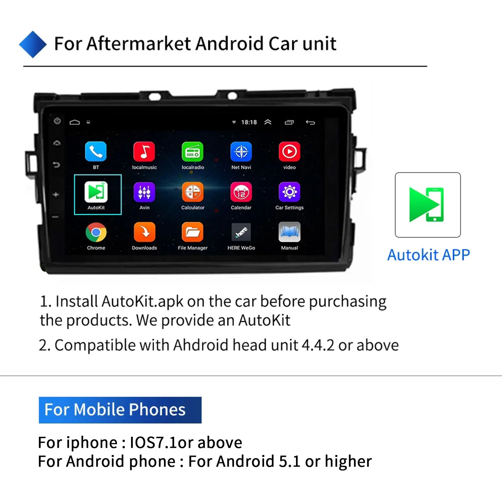 Особенности:1. Голосовое управление: Поддержка Siri / music / maps/телефонные звонки/сообщения/аудиокниги. Функция Siri поможет вам позвонить Розе или любому из ваших друзей. Пожалуйста, обратите внимание, что скорость работы нашего устройства зависит от скорости вашего телефона на ios.2. Сенсорный экран и hd-дисплей: направленное управление и просмотр телефона на экране автомобильной навигации с помощью usb-кабеля.3. Свободные руки и безопасное вождение: совершать/отвечать на звонки, проверять голосовые сообщения, текстовые сообщения и создавать карты.Слушайте ваши любимые песни с помощью приложения в формате «hands free», «Музыка» или «музыка».Характеристики:Совместимые устройства:Для iPhone с iOS (7,1 и выше)Для мобильных телефонов Android (5 .1 и выше)Автомобильные стереосистемы с android версии (4.4.2 и выше)(Продукт поддерживает большинство телефонов на рынке Android, но он не на 100% поддерживает все для телефонов Android и Android auto radio)Как использовать продукт:1. Установите APK для продукта в головном устройстве вашего автомобиля Android.2. Подключите продукт к usb-порту Автомобильного головного устройства Android.3. Сопряжение и подключение к Bluetooth iPhone с автомобильным Bluetooth (для iPhone также поддерживает подключение USB кабеля); Для телефона Android все еще нужно подключиться через usb-кабель.4. На экране автомобиля появится интерфейс CarPlay.Упаковочный лист:Модуль для CarplayПримечание:1. Оригинальный экран автомобиля не поддерживается, этот продукт работает только с экраном системы Android.2. Этот продукт поддерживает 99% послепродажное головное устройство Android и 99% для iPhone/для телефона Android.3. Этот продукт не работает хорошо для автомобиля Win-CE.4. Этот продукт не совместим с оригинальным заводским автомобильным экраном.