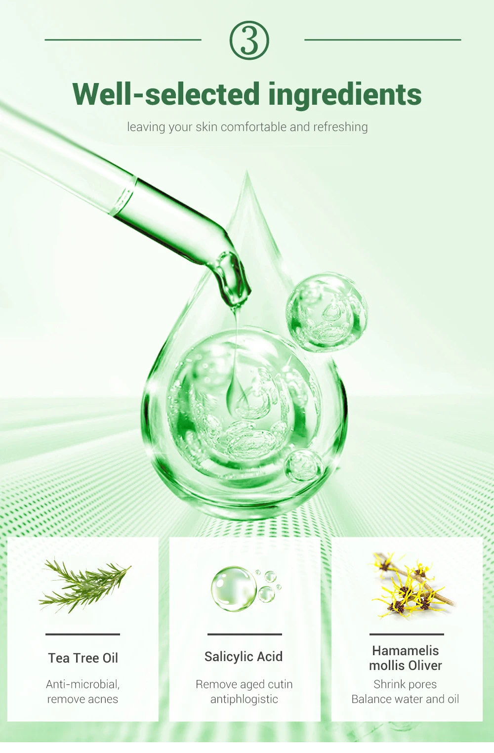 Тщательно подобранные ингредиенты оставляют вашу кожу комфортной и освежающей, антимикробное масло чайного дерева, удаляют акне салициловую кислоту, удаляют Состаренный антифлогистический кутин, hamamelis mollis Oliver, сужает поры, балансирует воду и масло, эффект фактического использования может быть заметен при правильном использовании продукта