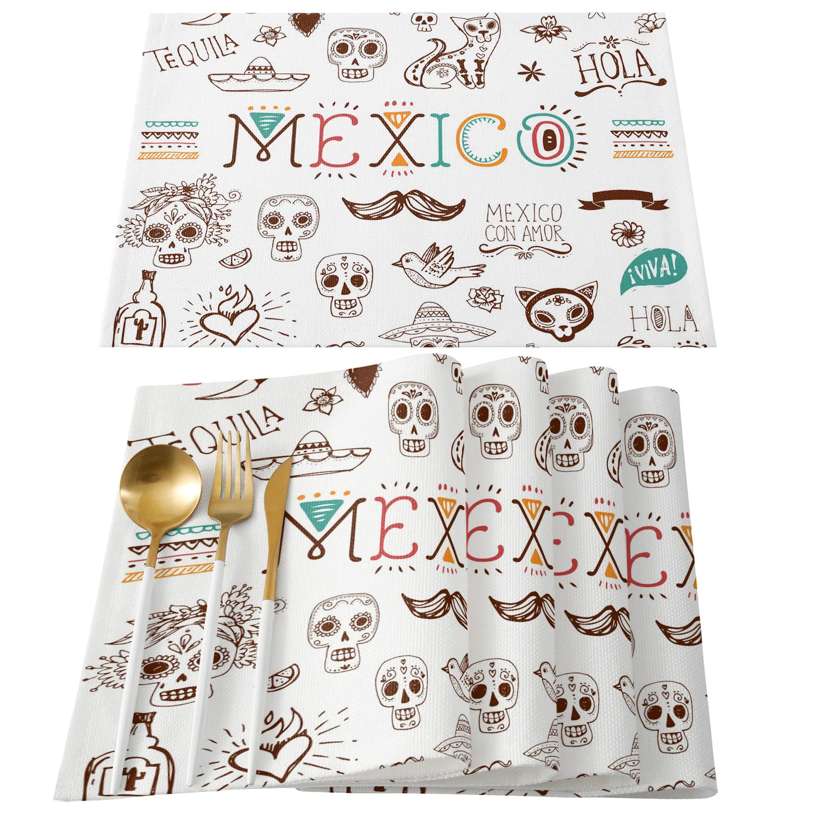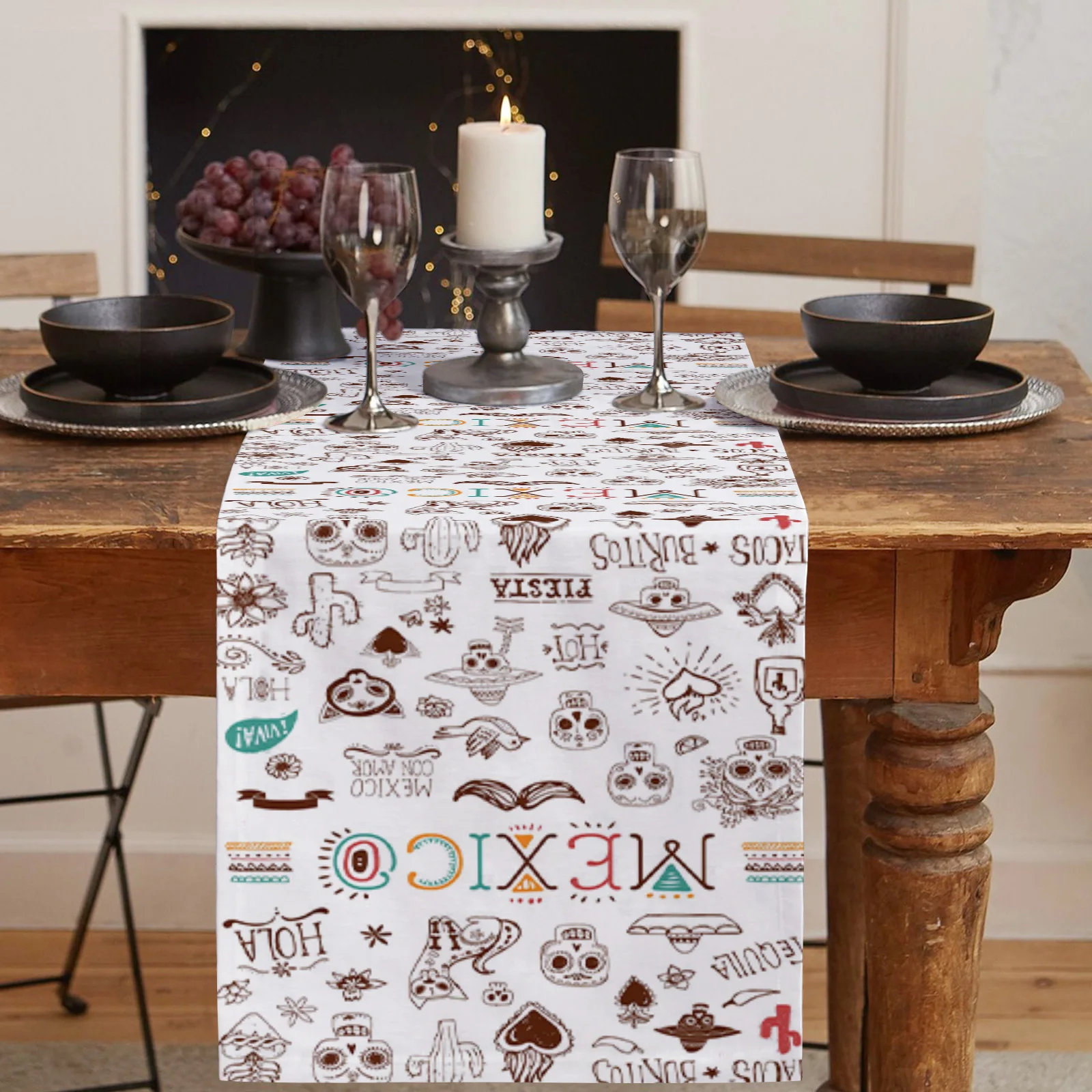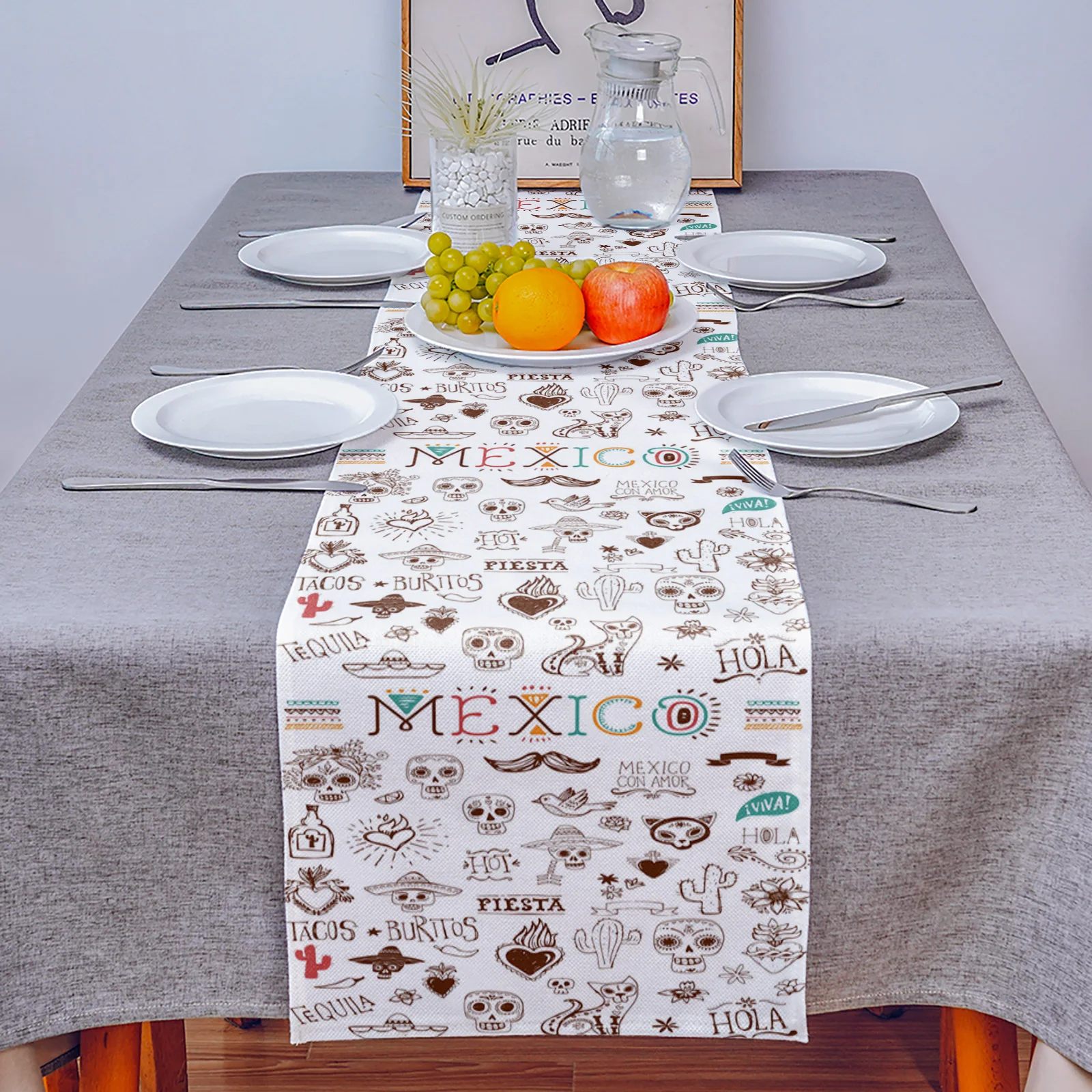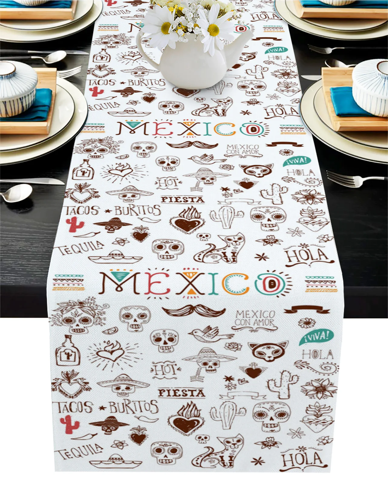 Мексиканский череп Ct и изображением мультяшного кактуса, Настольная дорожка дома Кухня обеденный стол Декоративная скатерть и салфетки Декор свадебного стола