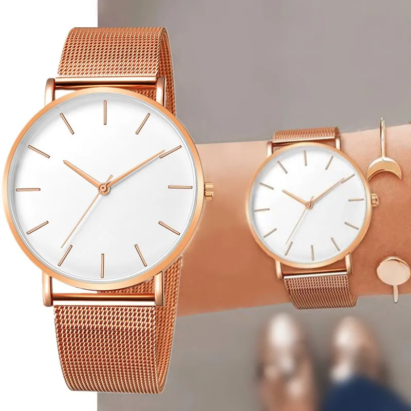 Часы наручные женские кварцевые, повседневные Простые, с сетчатым браслетом из нержавеющей стали, розовое золото 2021, 2021