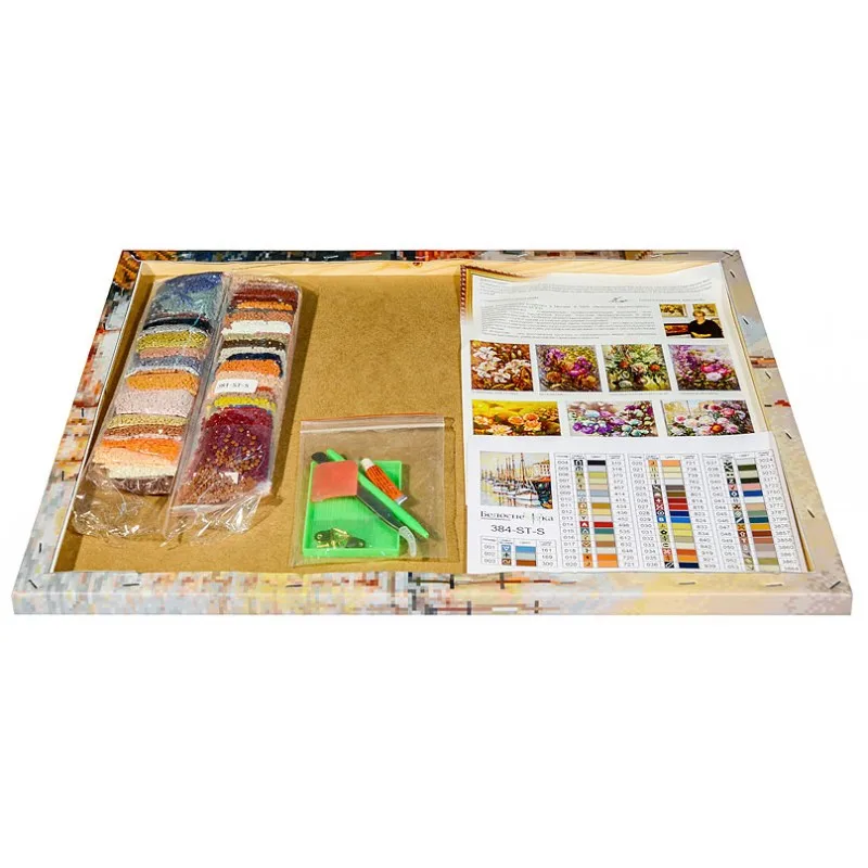 Наши наборы прекрасно подойдут для желающих попробовать себя в новом виде творчества, из полотна получается красивая мерцающая картина с природным сюжетом. Все сюжеты жизненные и авторские, разработаны по картинам современных российских художников. В комплект входят квадратные ограненные акриловые камни, которые расфасованы по цветам, на пакетах имеется наклейка с условным обозначением и номером. На холсте напечатана четкая цветная схема, поверх которой нанесен качественный клеевой слой, сверху клеевой слой защищает прозрачная пленка.