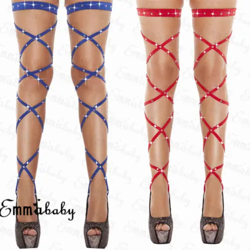 Пикантные Для женщин Бандажное ажурные чулки бедро-высоком каблуке с украшением в виде кристаллов с заклепками сапоги до бедра высокие рейв обертывания ремешками Стразы колготки