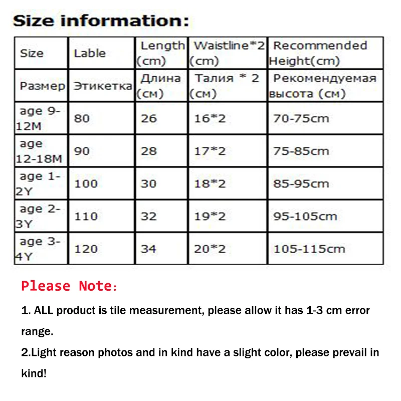 РазмерыЛаблеДлина (см)Талия * 2 (см)Рекомендуемая высота (см)РазмерЭлектронная сигаретаДлина (см)Талия * 2 (см)Детская одежда (см)Возраст 9-12 м802616*270-75 смВозраст 12-18 м902817*275-85 смВозраст От 1 до 2 лет1003018*285-95 смВозраст От 2 до 3 лет1103219*295-105 смВозраст От 3 до 4 лет1203420*2105-115 смОбратите внимание:1. Все продукты являются измерениями плитки, пожалуйста, учитывайте погрешность в 1-3 см.2. Пожалуйста, при покупке выбирайте размер в соответствии с таблицей размеров. Если вы не понимаете их, пожалуйста, свяжитесь с нами. Сообщите нам вес и рост ваших детей. Мы поможем вам сделать лучший выбор.3. Светильник причина фотографии и в натуральной форме, у вас есть s светильник цвет, просим отнестись к этому с пониманием!