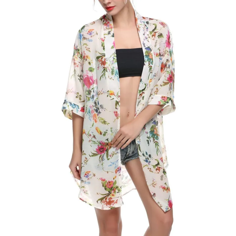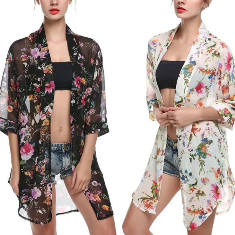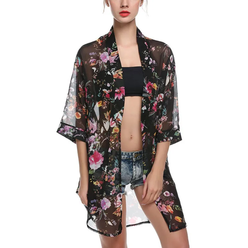 Женское шифоновое кимоно с цветочным принтом, пляжный кардиган, про...