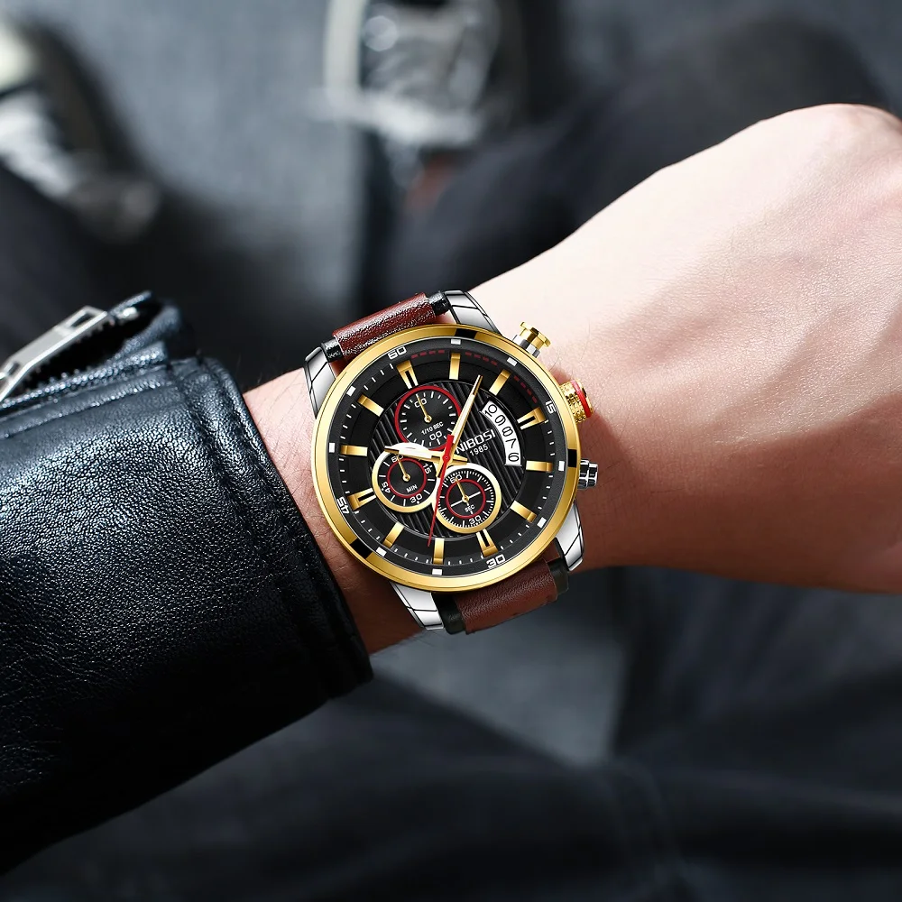 Часы NIBOSI 2372, Брендовые мужские часы, военные, спортивные, водонепроницаемые, кварцевые часы с хронографом и кожаным ремешком для мужчин, мужские часы
