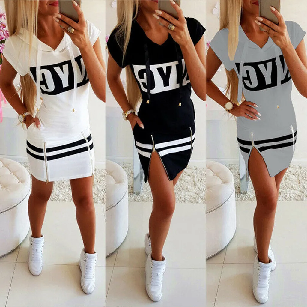 Женское модное платье-пуловер на молнии с капюшоном и принтом, облегающее Свободное платье с коротким рукавом, пикантное мини-платье с разрезом и круглым вырезом, 2021